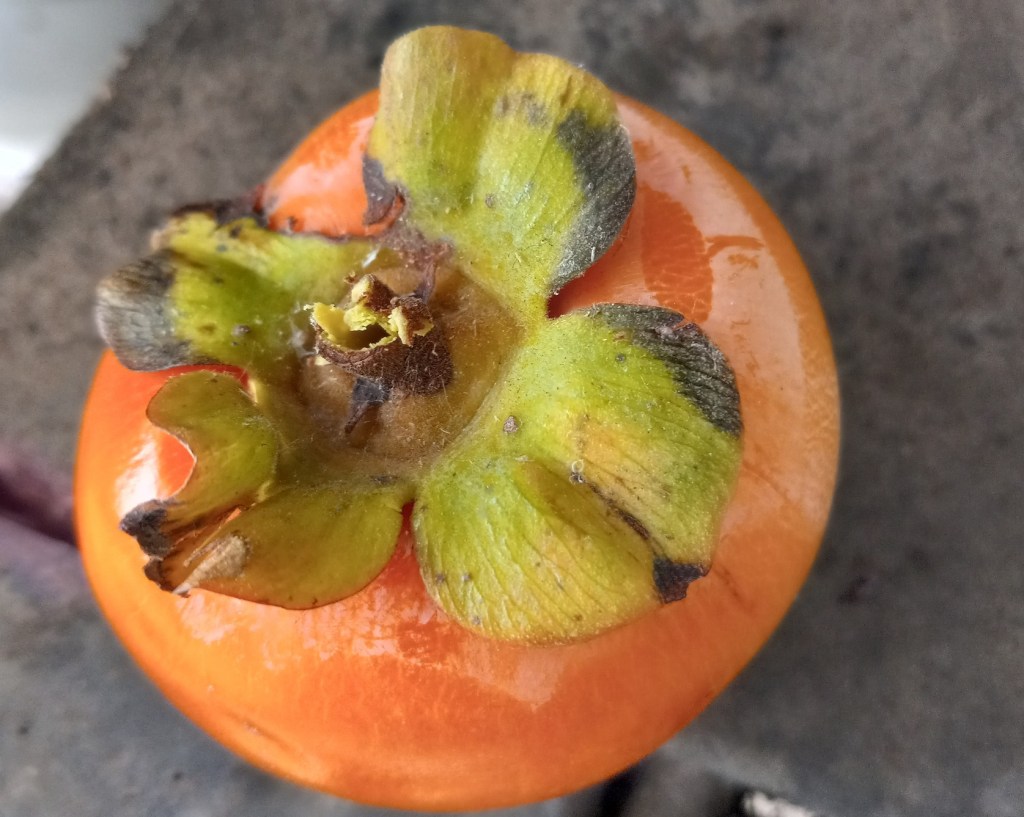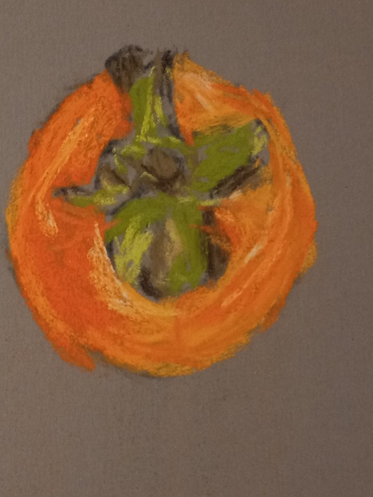 The photo is of the specific persimmon, but was taken afterward, and is rotated 90 degrees to the viewer’s left relative to the sketch.