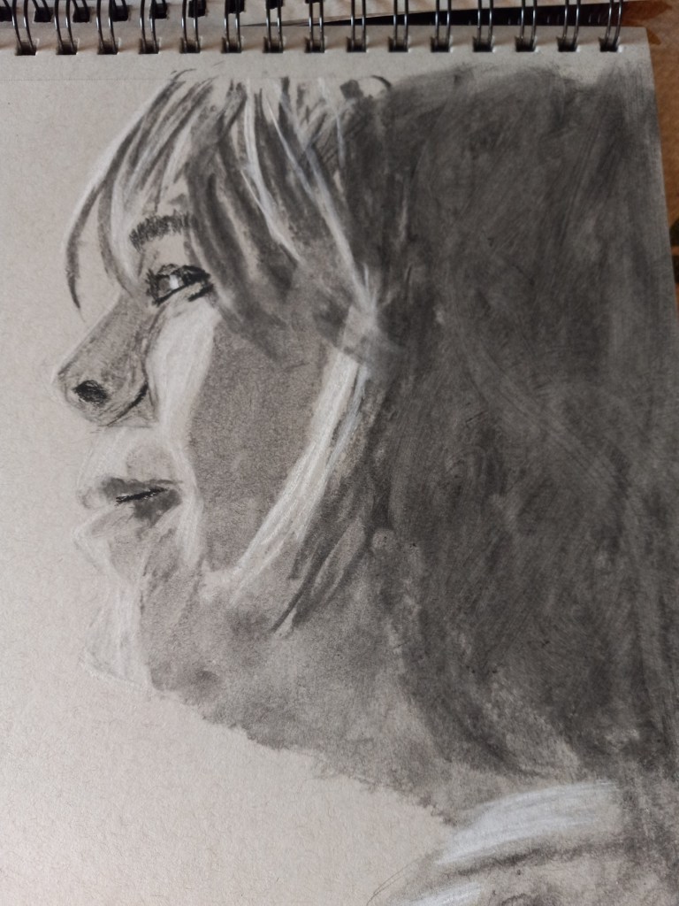 This portrait is based on a photo I downloaded from Pixabay. I used soft vine charcoal for the large shaded areas, For the more detailed areas, I used charcoal pencils 2B and 6B, in addition to Conte crayon in light gray, with mere touches of Conte in white. The rendering was done on Strathmore 400 gray toned sketch paper.