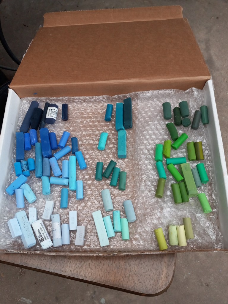 I’ve finally done it… I’ve gotten all my pastels out of their respective boxes, and removed the labels. I don’t have a fancy wooden tray yet, but I did buy from Jerry’s Artarama a 3-drawer wooden storage cabinet. It will hold some but not all of the pastel pieces I have, so I’ll be improvising with cardboard boxes for now.