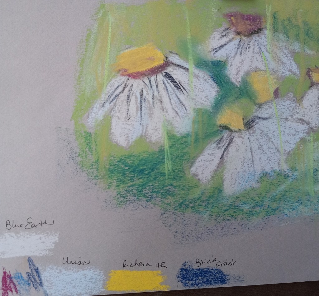 My experiment was largely to see which pastels work best on this paper. I noted the results at the bottom — Blue Earth and Richeson Hand-Rolled covered the paper much better than Unison or Blick Artists’ Soft Pastels. (Of course, that may also be the function of my skill level.)