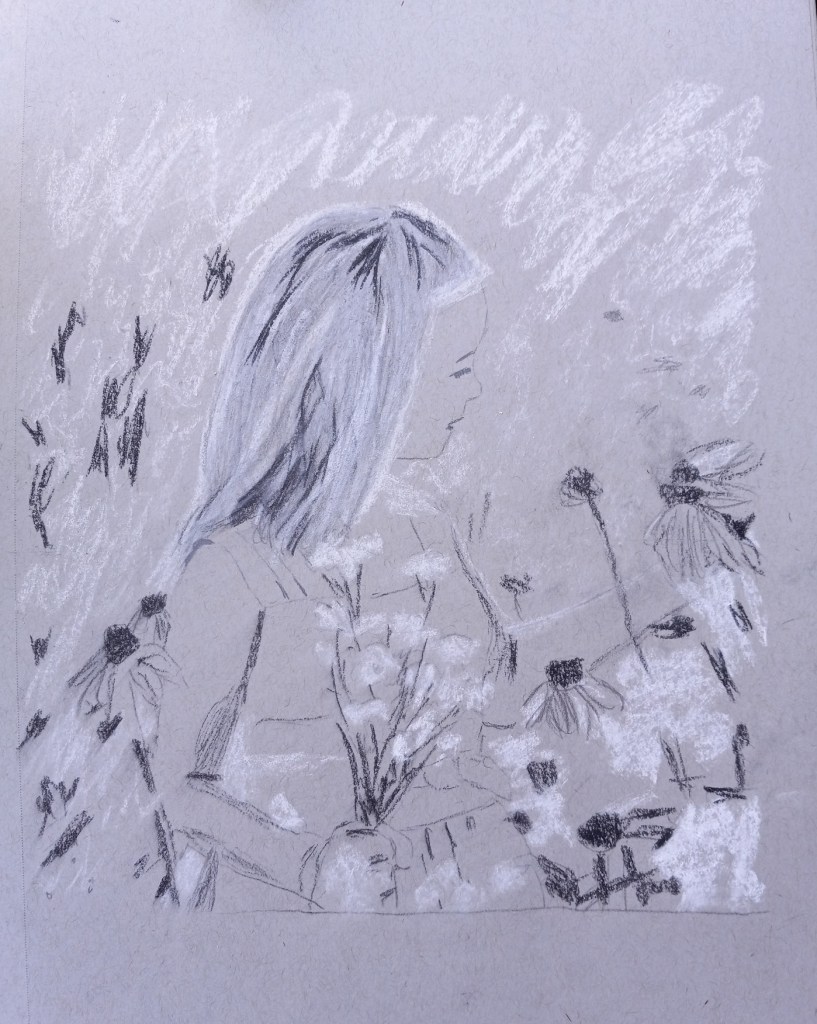 This drawing — done in graphite, compressed charcoal, and white Conte crayon — was based on a photograph from Pixabay, which I cropped and changed to grayscale.