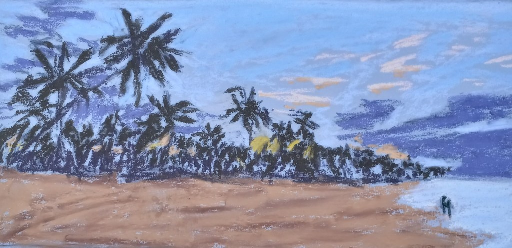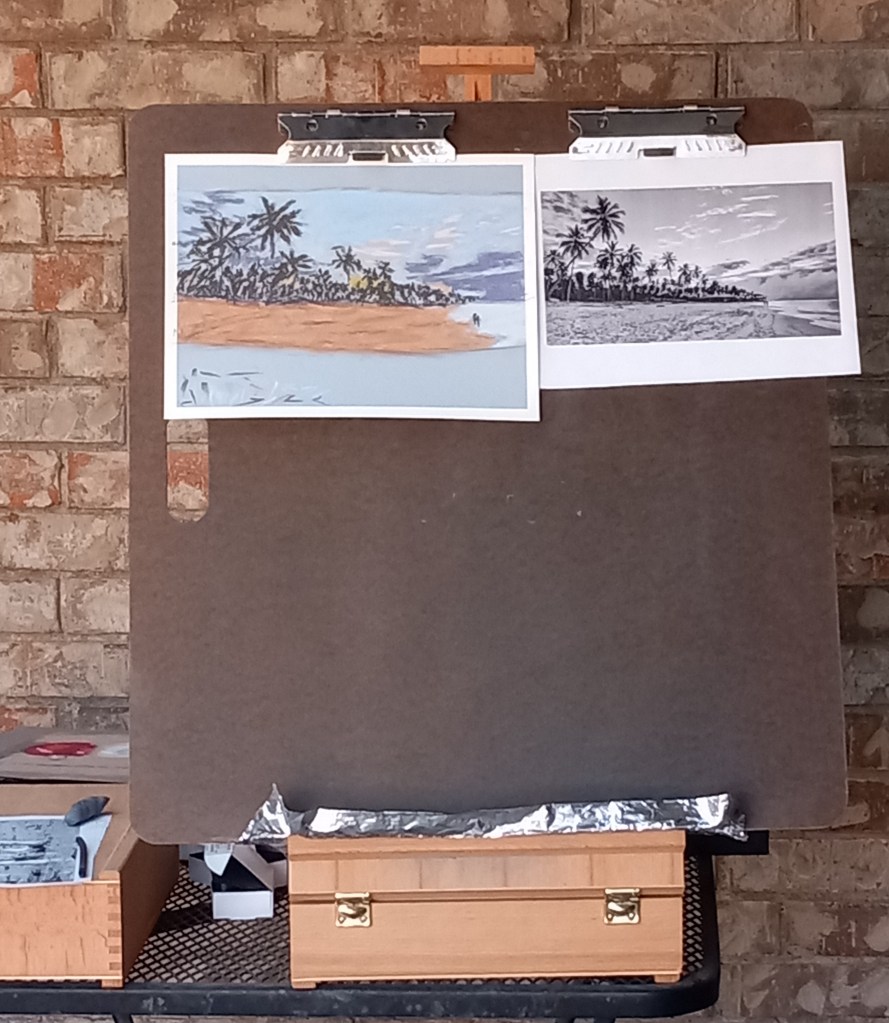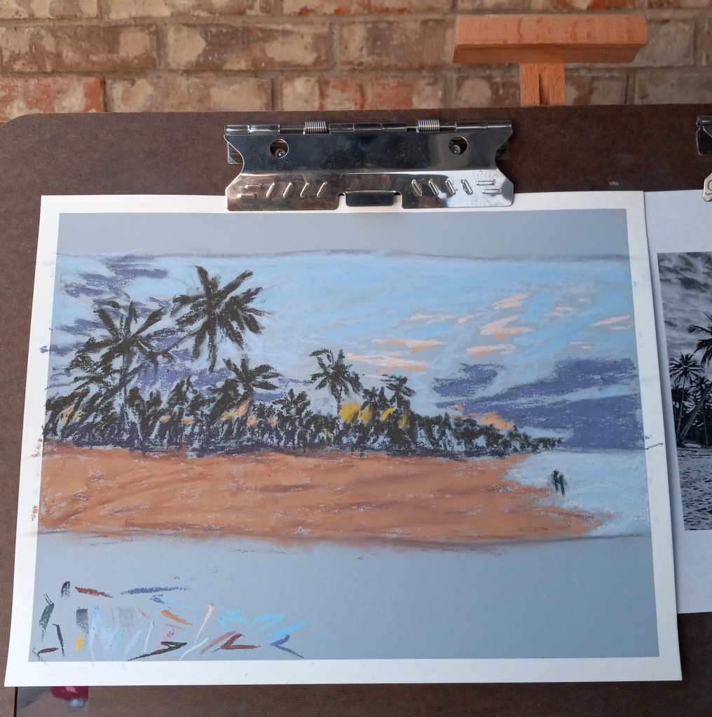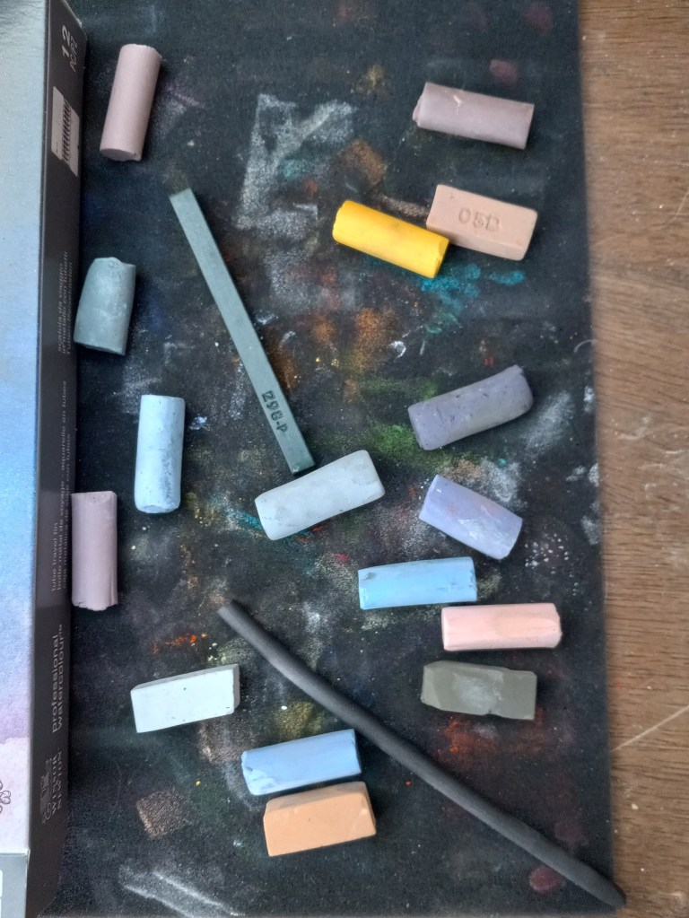 I used ArtSpectrum Colourfix Smooth in Blue Haze. My underpainting was done with willow charcoal, and I used Blue Earth, Blick, Richeson Hand-rolled and Sennelier pastel half-sticks.