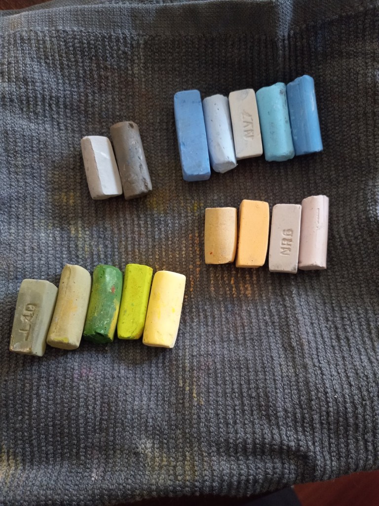 Today I tried velour paper that I received in my sampler from Jackson Art. It was a very different texture; it feels to me the pastels just lay down on the top of the paper. And that the paper almost “resists” side strokes. It was fun to try, using Richeson, Blue Earth, Dick Blick and my one Terry Ludwig pastel, but I’m not certain I would buy this paper on a regular basis.