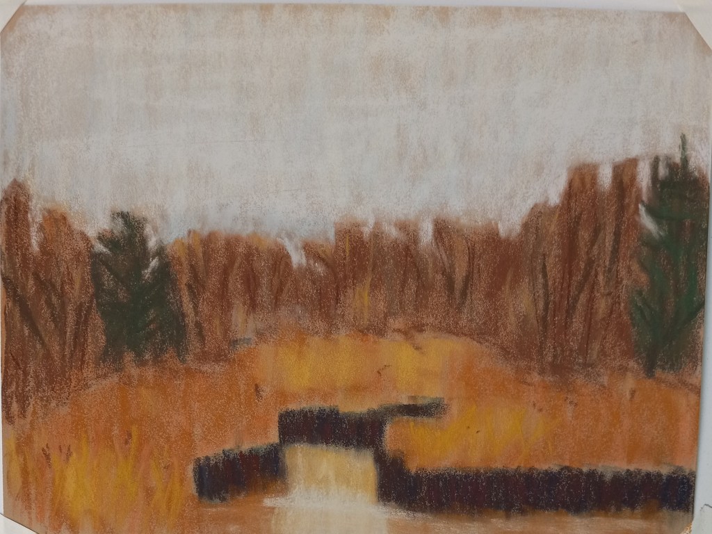 This work is based off a photo by Pexels from Pixabay. I did it on a 9×12 piece of Pastelmat in sand color. I did an alcohol wash underpainting, using NuPastels in orange, rust and deep dark blue. Most of my pastels were Blue Earths and Richeson Hand-rolled, the latter quickly becoming my go-to pastel sticks.