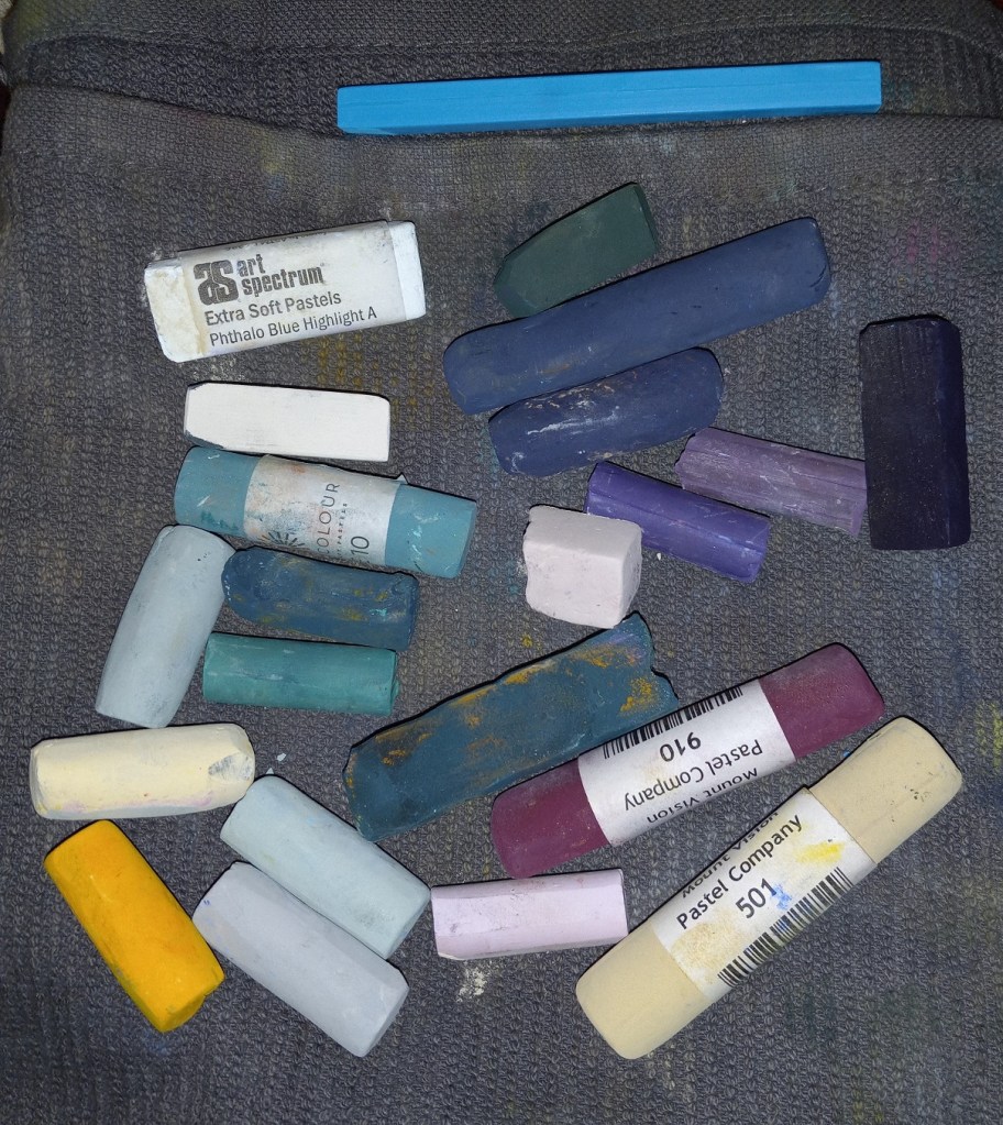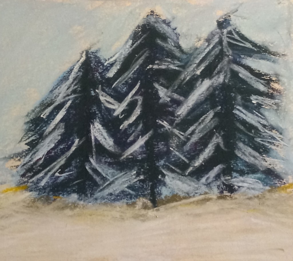 I used a turquoise NuPastel for the underpainting of the fir trees, and the fact that it peeks through is about the only thing satisfying about this effort. The photo doesn’t show the snow well, but I used yellows, pinks and light blues as the snow rather than straight white. The snow on the branches was actually a very pale yellow color — almost white — and a Blue Earth pastel.