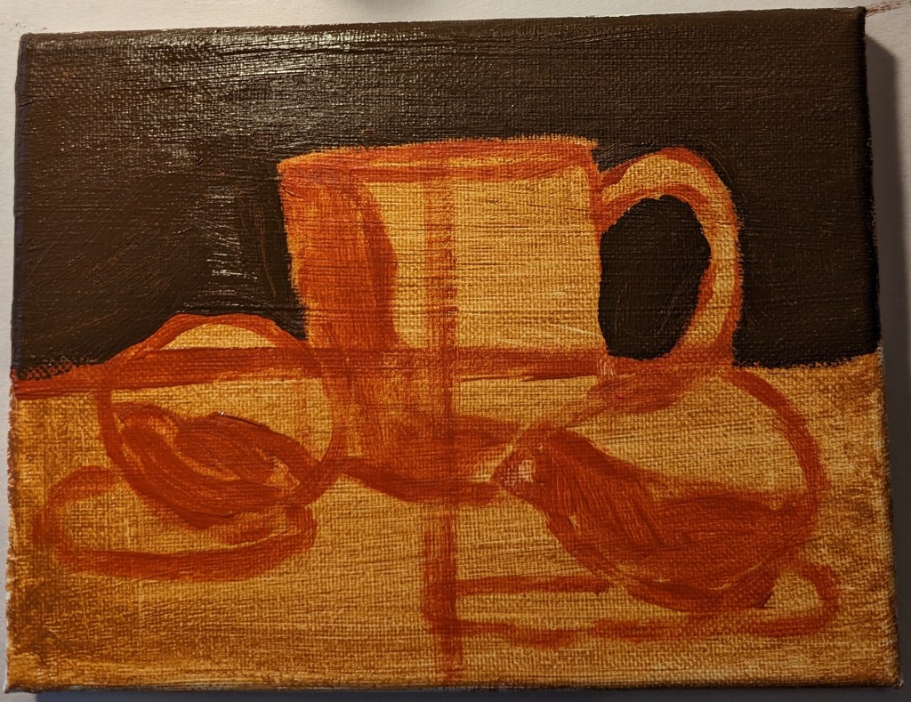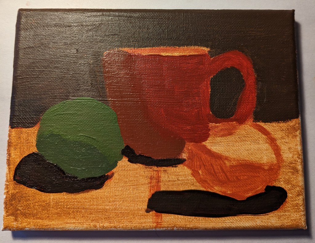 One of the first paintings I did was a still life. (I still need to learn how to photograph my work; the glare is from my desk lamp — my “studio” is the same dining room table where I worked my job during the Covid lockdown.)