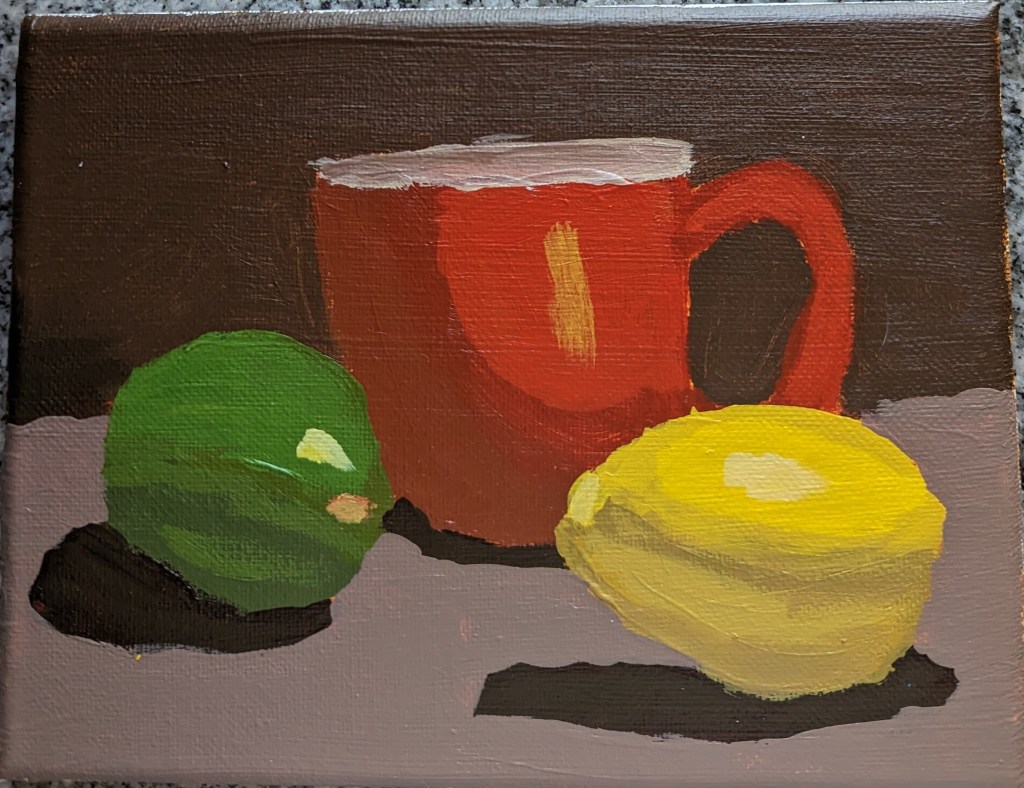 I like the cup the most — except for the messed-up lip (way too light!). I think I did a better job mixing colors for the lime, but the lemon is completely messed up. I kept fiddling with it, and made it worse.