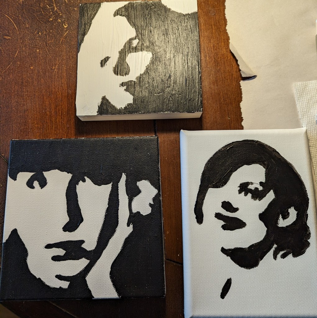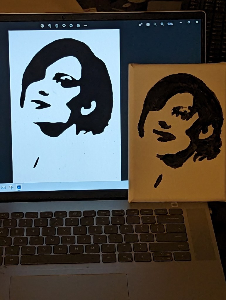 The top-most picture was done on wood covered with gesso painted with an old brush (hence, the ridges.) Some folks say to sand your gesso application, but I didn’t want to hassle with that. Below is a comparison between the actual notan (posterized photo) on the computer screen, and my painted image on the right. Close but not exact.