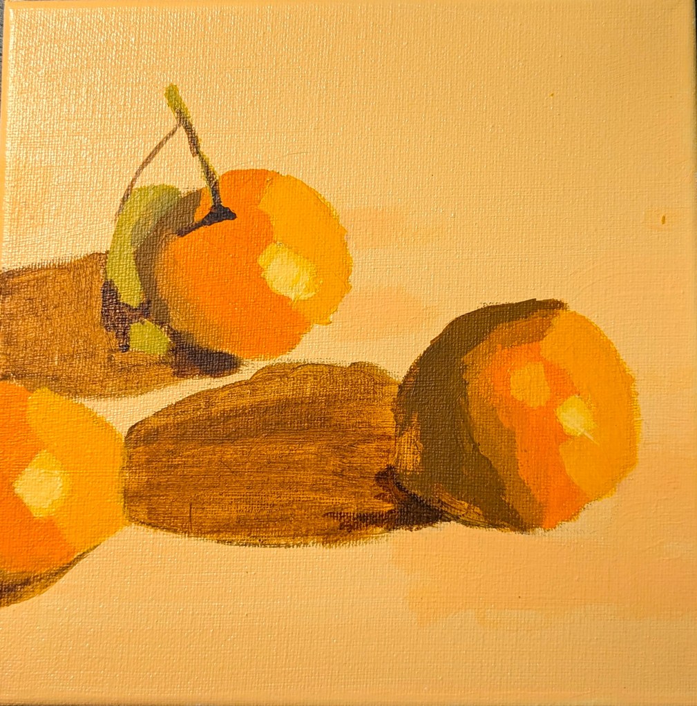I bought Kemp’s Still Life Acrylic Project E-Book, and am working through it. First up was a project that involved painting a group of clementines. Much of the focus is on setting up your colors by color mixing, which is something I need to learn about.