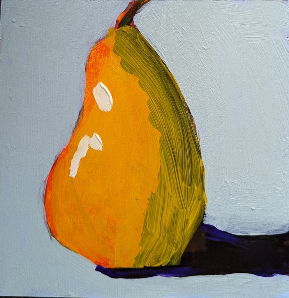 Funny thing, after all this pear painting, I was at the grocery store today, and for the first time I really noticed all the pears in the produce section; each type has its own shape. I think of this shape as somewhat close to a “classic” pear, but that’s really the Bosc pear. Some are short and squat more like gourds or squash.