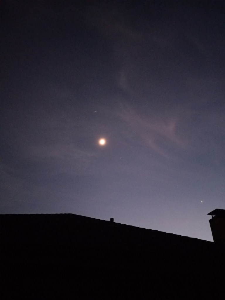 For this study, I used another of my own photos — this one taken one evening in early December of 2021 from my backyard. The Moon was actually a crescent at the time, but I had a cheap smartphone at the time with a lousy camera, so it looks full, and I carried on with that in my painting. Jupiter is shining above the Moon, and Venus is near the silhouette of the chimney.