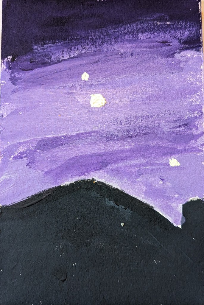 This was done on a 4×6 piece of 300 lb. cold-pressed watercolor paper. The house silhouette is blue-black, and the sky was painted in tints of dioxazine purple. The Moon, Jupiter and Venus are painted in a yellow-white mix.
