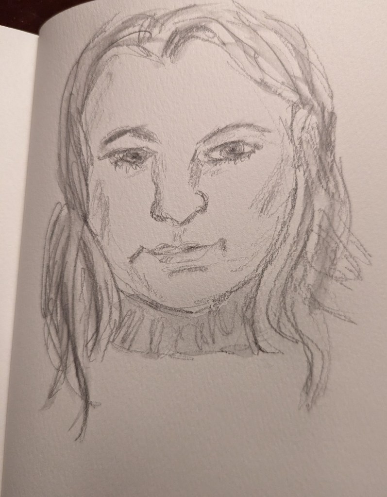 Quickie Sketch: A Face August 30, 2023August 30, 2023 | cathmary1030 I’ve been away from drawing and painting for a few weeks now… must be the summer heat. Finally picked up my Aquarelle pencils and sketch book to do this quickie face. Share this: Click to share on X (Opens in new window) X Click to share on Facebook (Opens in new window) Facebook Like Loading... Related