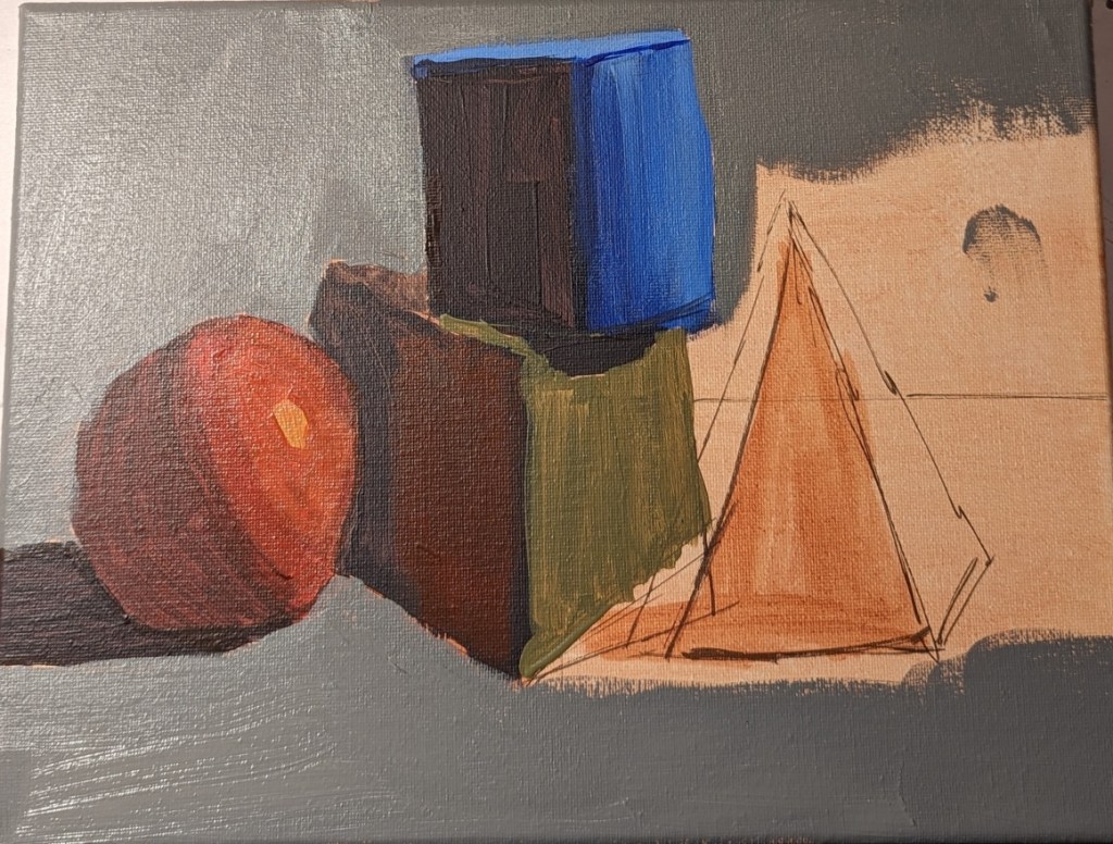 Then there is the issue of color. I didn’t want the super-dark background, but the red sphere is too brown, as is the olive-green square. And in the photo the blue cylinder looks more square in the photo of my painting than it does in real life. Sigh.