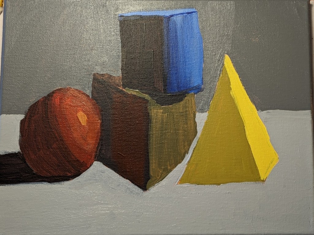 The most glaring mistakes are that I didn’t get the relationships between the blocks right, especially the yellow pyramid, and I don’t have a shadow for the yellow pyramid! (I could add one, but I want to move on.)