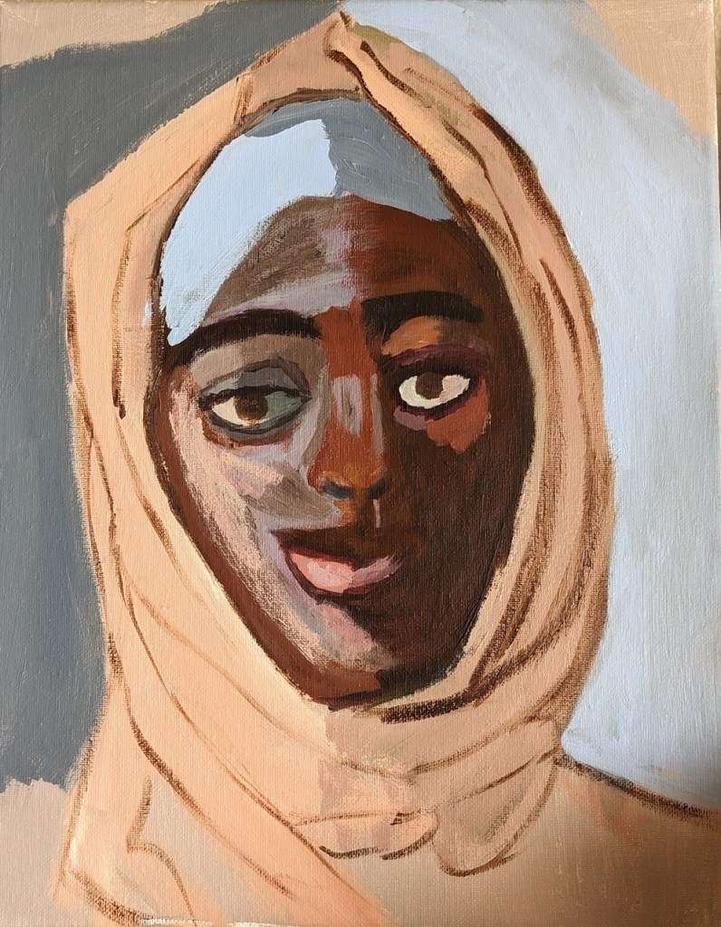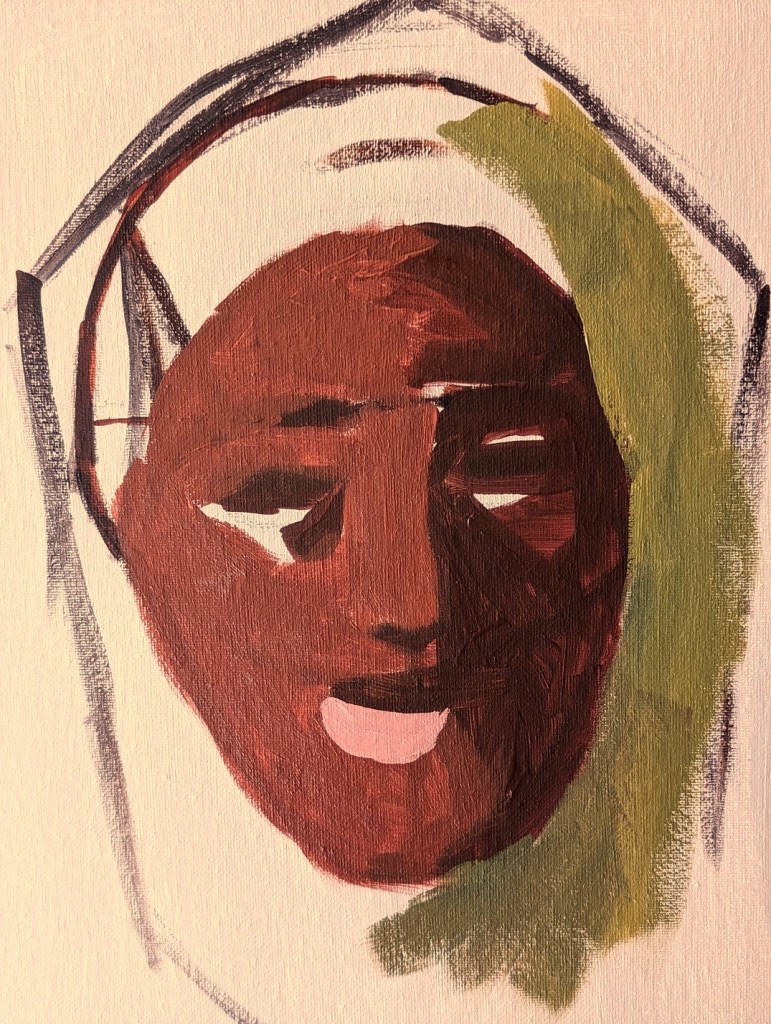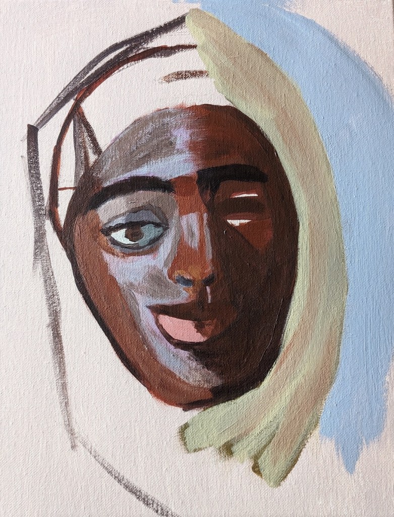 Again, as with so much that I’m painting these days, this was from an online tutorial by PaintCoach. I tried using Golden Open Acrylics thinking they would work more like oils — that’s how they seem to be advertised — uh, no, didn’t work at all. The light on her face looks more like a crazy mask than seamlessly blended in.