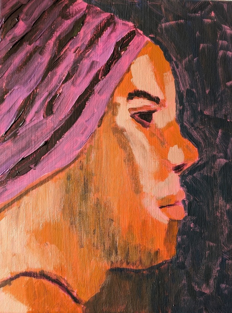 As with the work done in this earlier post, I did another follow-along/demo portrait from Hashim Akib’s book Painting Portraits in Acrylic. I bought some student-grade acrylics (Amsterdam brand) since this is merely practice. The background was toned in a Quinacridone Rose (PV 19) as directed, but I drew out the figure using willow charcoal. As for the skin colors, again I followed along mostly: the primary skin colors are burnt sienna, orange (PO 73) and yellow ochre (PY 42).