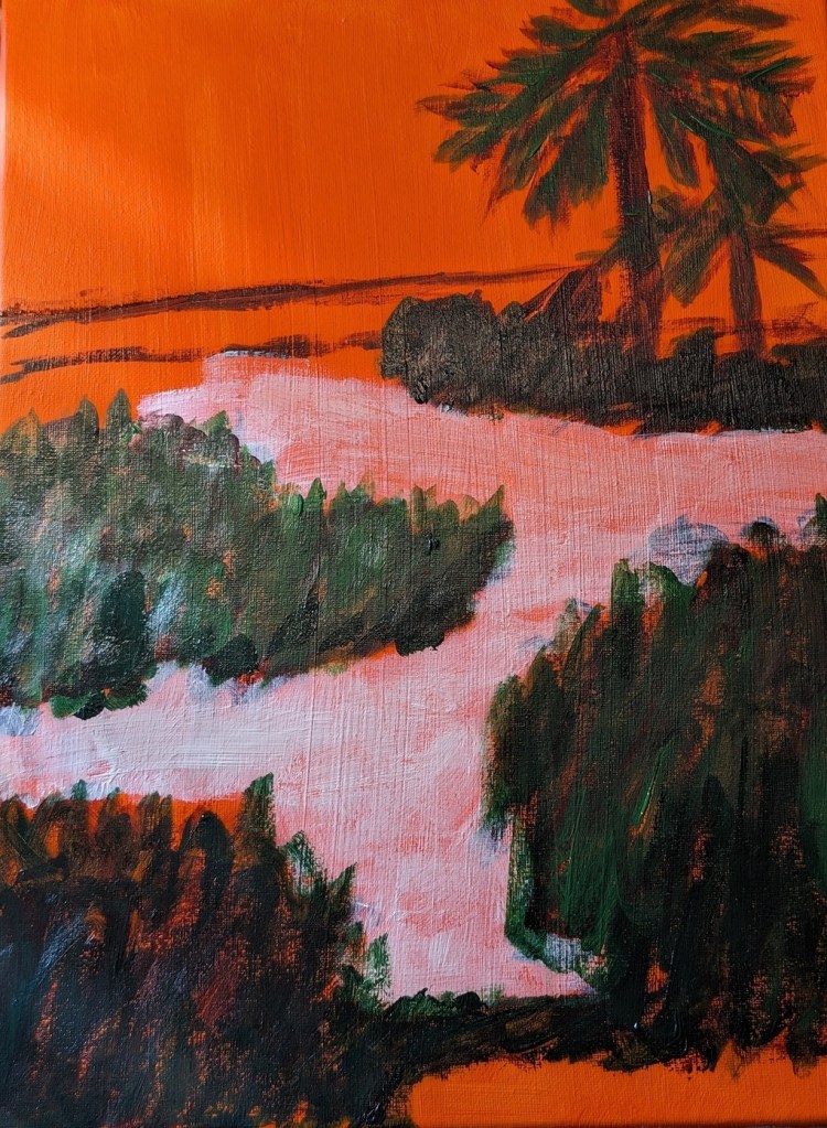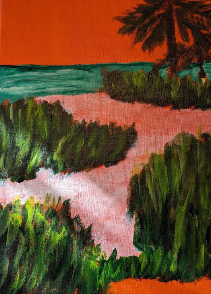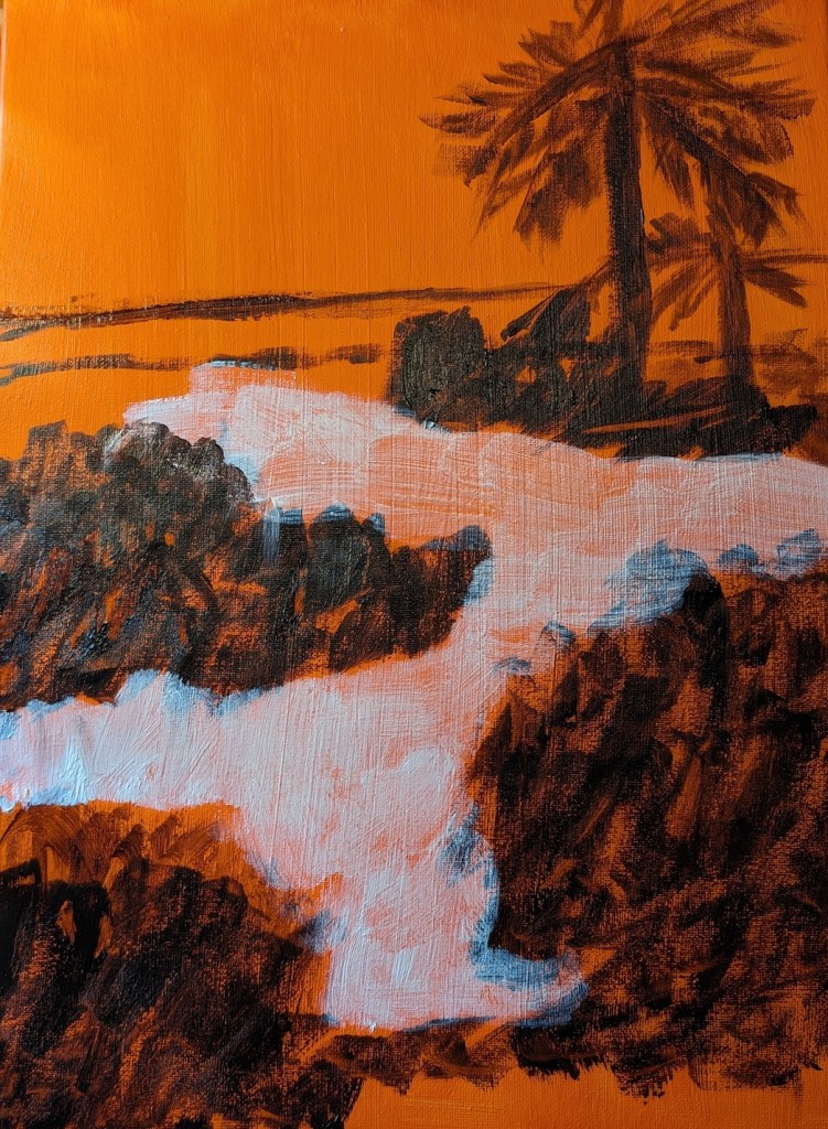 I used Transparent Orange (PO 73) by Chroma Atelier as a background, then Sap Green mixed with Carmine (Amsterdam Acrylic) for blocking out the greenery. For the grasses, I used the Amsterdam’s Sap Green and Yellow Green, as well as Winsor Galeria’s Sap Green (much lighter than Amsterdam’s Sap Green). The sky is Light Blue Permanent by Liquitex Basic; the ocean is Phthalo Green mixed with Titanium White.