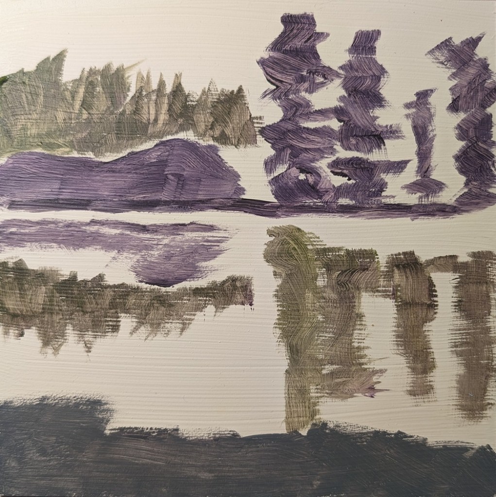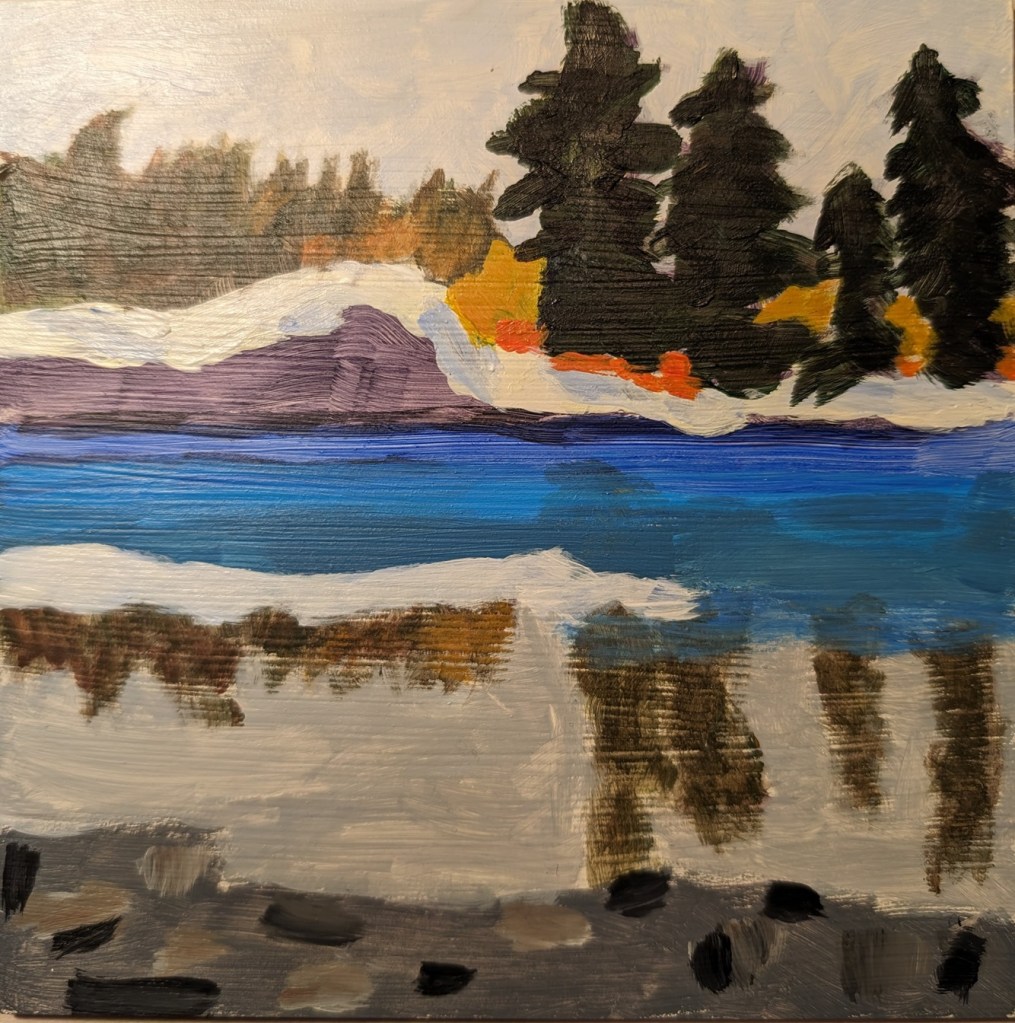 This was week 2 for Jed Dorsey’s Mini Painting Challenge at Acrylic University. The focus was on the reflection of the trees and land in the lake.