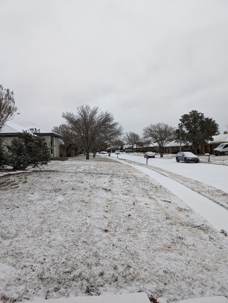It was 10 degrees Fahrenheit this morning — I believe that is a record for today (January 15th). AND a light dusting of snow. D/FW Airport — about 10 miles to the west — got over an inch, due to lake effect snow from lakes north of the airport. I associate lake effect snow more with Buffalo than Dallas, but there ya go. First time for everything.