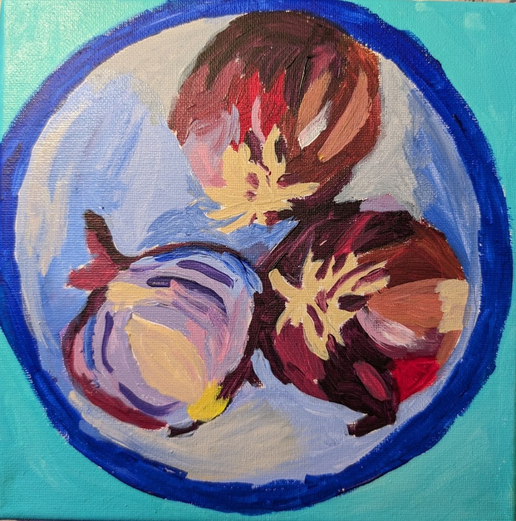 I discovered Vicki McGrath on a “Learn to Paint” podcast, and then followed her on Instagram. After my first attempt at the red onion from my Acrylic University lesson, I attempted to copy Vicki’s work, although I changed the background from green stripes to a solid mint green via phthalo green yellow shade. She paints in gouache on watercolor paper; I used acrylic on an 8×8 canvas. Her version is available as a print here.