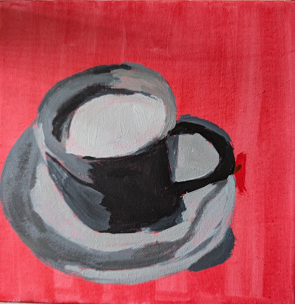 It’s been 7 weeks since I’ve picked up a paintbrush… just busy doing other things, (like reading for a book club, Ancestry DNA analysis of my mom’s matches, and some day trips w/ hubby). I had this red-toned 8×8 canvas lying around so decided to do a grayscale version of a coffee cup (image from Unsplash).