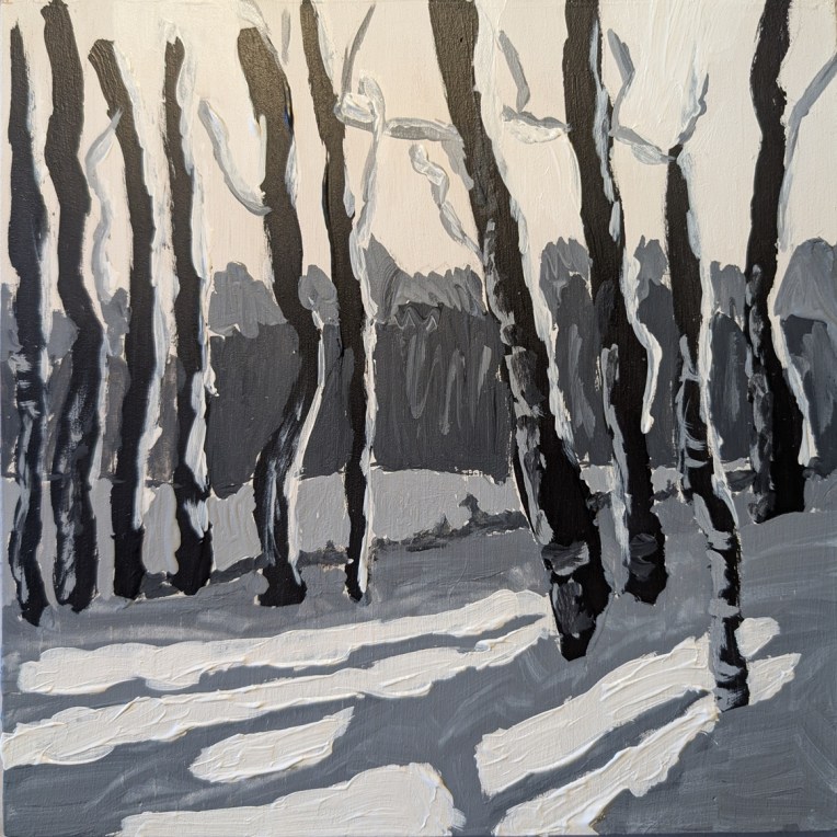 This was done strictly as a study, on an 8×8 wood panel that I had gessoed a while back. The sky, in fact, is simply the white gesso. (It’s more yellow here in the photo than it is in real life.) I deliberately painted the snow thick just for the heck of it.