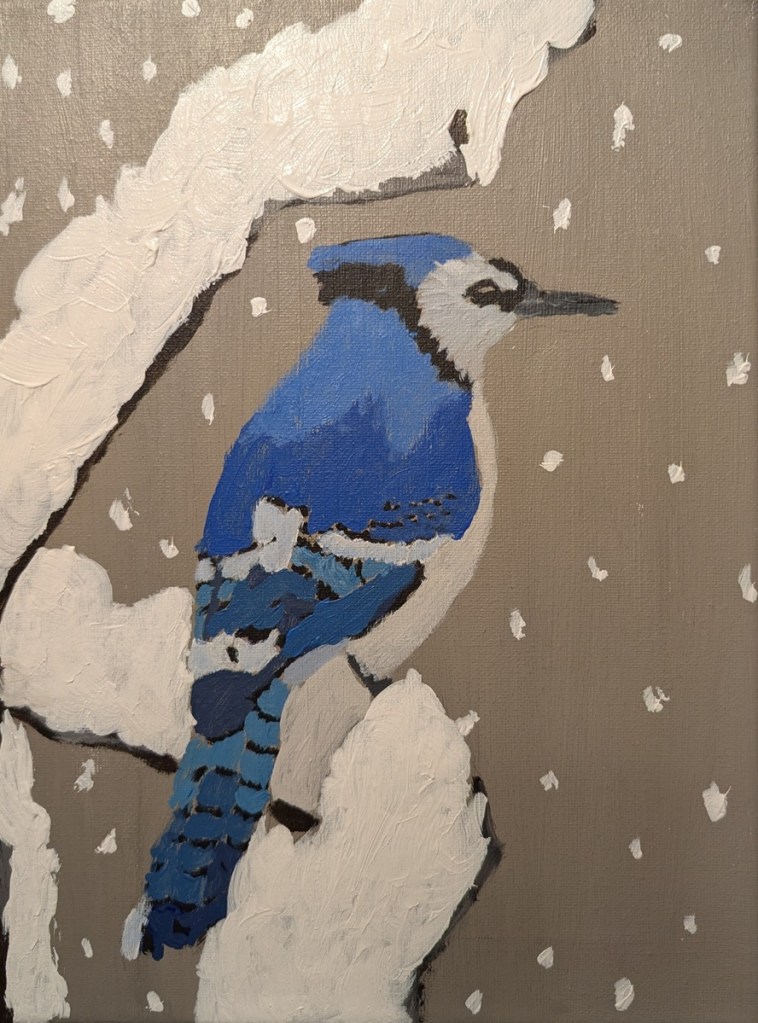 I was drawn to this photo of a blue jay on a snowy branch over a year ago, and the 9×12 canvas has sat toned and drawn out waiting for me to paint it. That day was today.