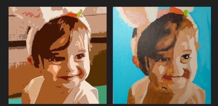 I cropped the original photo to focus on the face, then used the Cutouts option within Adobe Photo Essentials, and then transferred the image to the canvas panel. What is most off from the photo is the nose and mouth; I’ll have to redo that and see if I can make it more exact to the contours of the child’s face.