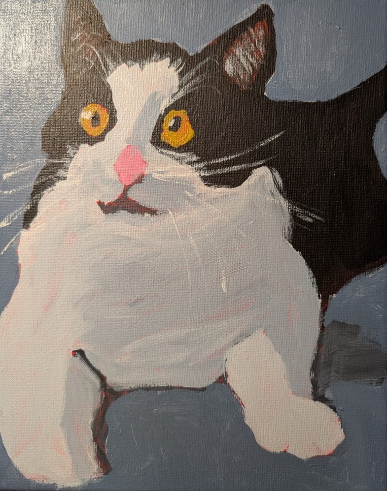 Okay, I’m done with this. I revised the background, modified the eyes and nose, and added whiskers, and ear fur (dry brush). I wish I hadn’t used the red for the undertone, but it is what it is.