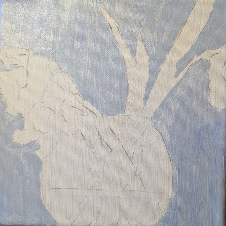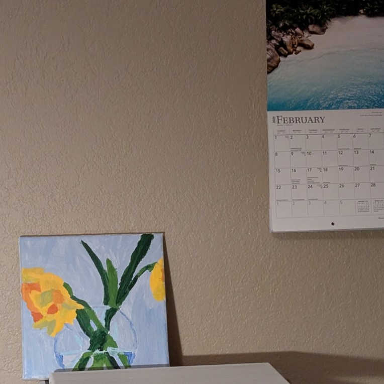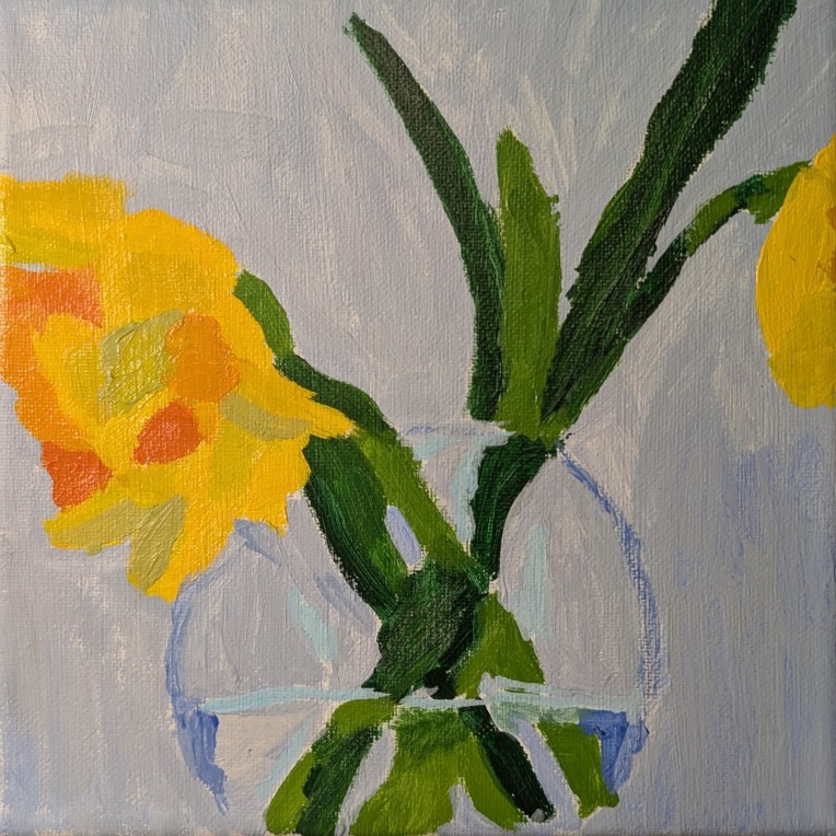 This painting done on an 8×8 canvas is from a reference photo at Fresh Paint, an online art class/community led and taught by Ali Kay. In her lesson for this painting, which I scanned briefly, she didn’t mention the source of the photo. It may have been one of her own; I searched Pixabay and Unsplash, and did not find anything similar.