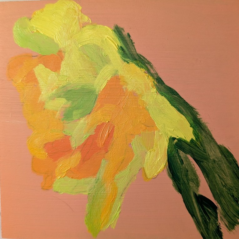 I wanted to work on the daffodils because they’re just a blur in my last painting. I did this on an orange-toned 5×5 wood panel, and actually traced the reference image (which I got from Ali Kay‘s Fresh Paint site) on to the panel, adding most of the detail. I had hoped it would help. Alas, it’s still a case of garbage in-garbage out.