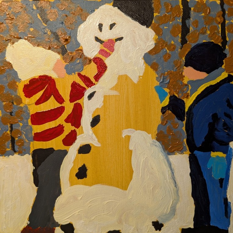 This is a painting I’m doing on an toned-in-yellow-ochre 8×8 canvas that is one of three cute kids-playing-in-the-snow painting lessons on Ali Kay‘s Fresh Paint site. Unlike the “Rolling Snow” painting I just finished, I have not referred to Ali’s painting or to her video at all. I’m just using her reference photo.