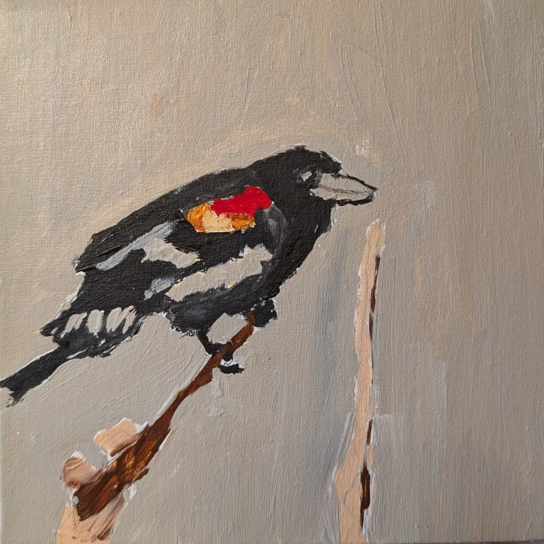 This painting was done on a 6×6 canvas panel, and is based on a photo I found on Pixabay. I’ve had this reference photo for seemingly forever, but it wasn’t as exciting to paint as I thought it would be. (I live near a creek with lots of reeds, where red-winged blackbirds hang out.)