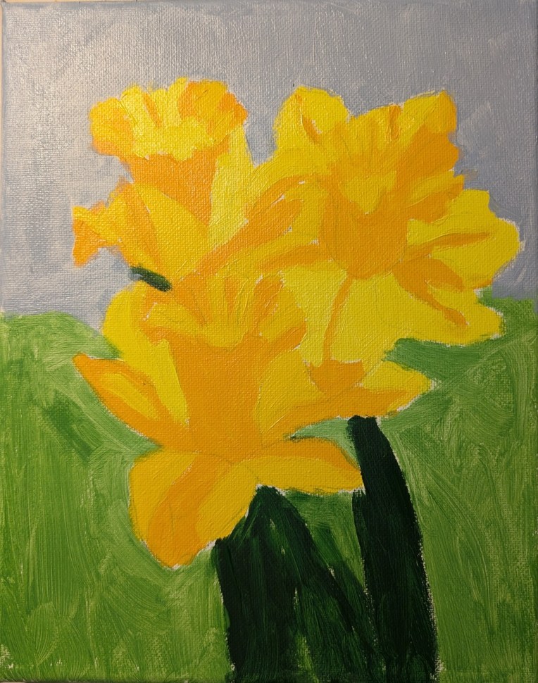 This painting was done on a 8×10 canvas, and is based on a photo I’m not sure where it came from — probably Pixabay, but possibly from my own collection, as I love daffs and photograph them when I can.