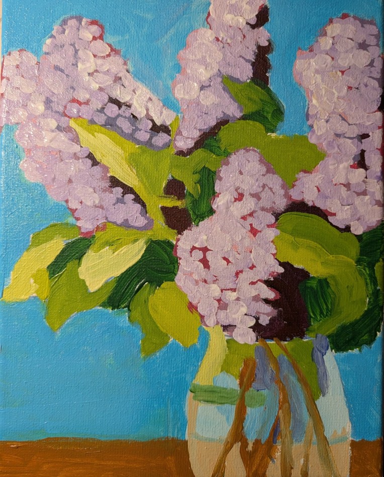 I outlined these lilacs on an 8×10 canvas over a year ago (based on a template found on Ali Kay‘s Fresh Paint site.) Finally got around to painting it — using the reference photo Ali Kay provided, and NOT copying her style at all.