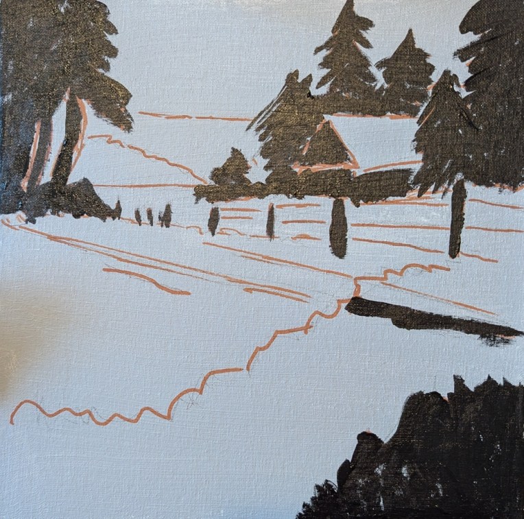 I’m working this on a 12×12 canvas, toned in neutral gray with a freehand drawing based off what I saw on the video. (This site is one in which you do NOT have to have a membership.)