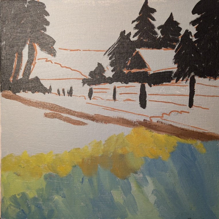 I recently came across a selection of videos at Jed Dorsey’s YouTube channel called “For the Love of Painting”, and fell in love with the painting Jed calls “Golden Fields & Rustic Barns“.