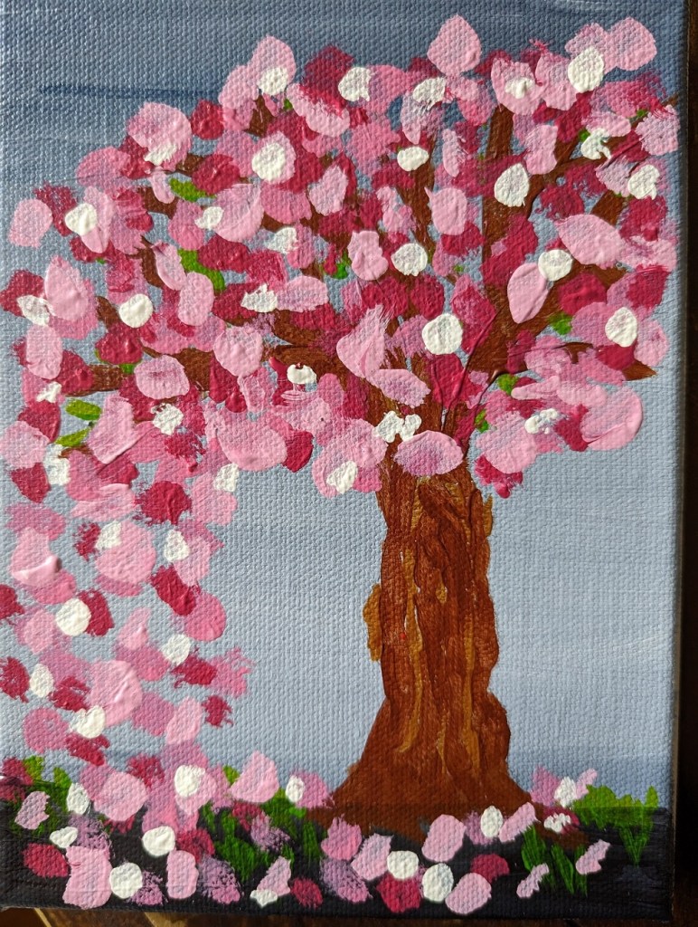 One of the first paintings I did was a still life. (I still need to learn how to photograph my work; the glare is from my desk lamp — my “studio” is the same dining room table where I worked my job during the Covid lockdown.)