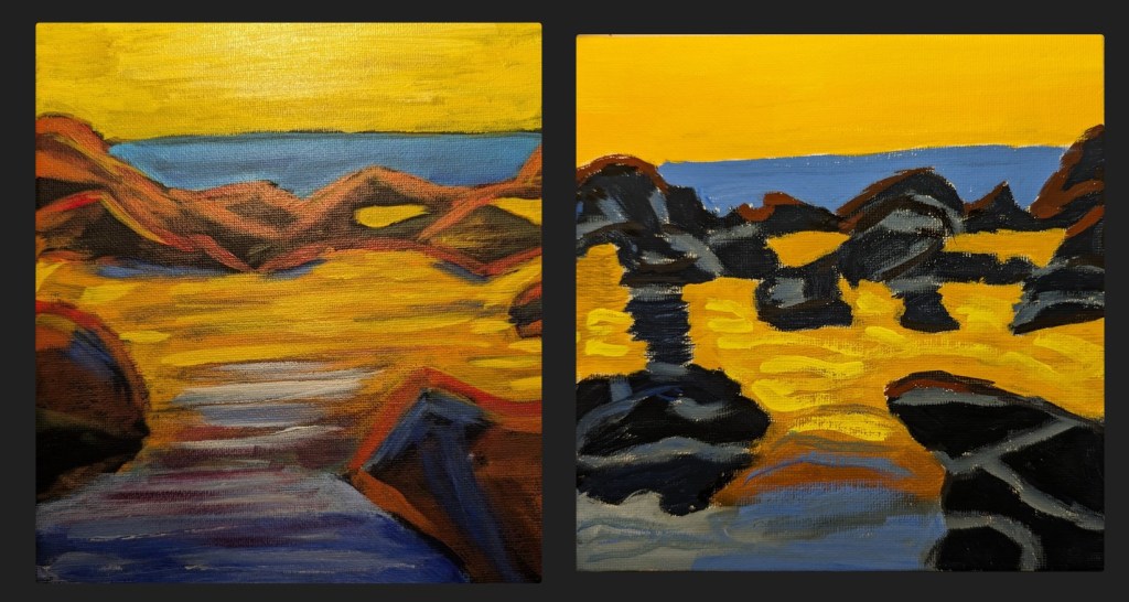 This is the week 6 painting for Jed Dorsey’s Mini Painting Challenge at Acrylic University. It’s based on a photo Dorsey took of a rocky beach at sunset. I used one of my last few 8×8 black canvases because Dorsey paints his version on a black background. (I think I’ve said this before, but I really struggle with a black background; it throws the colors/values off, and you need several coats of paint to hide the black say, against the sky).