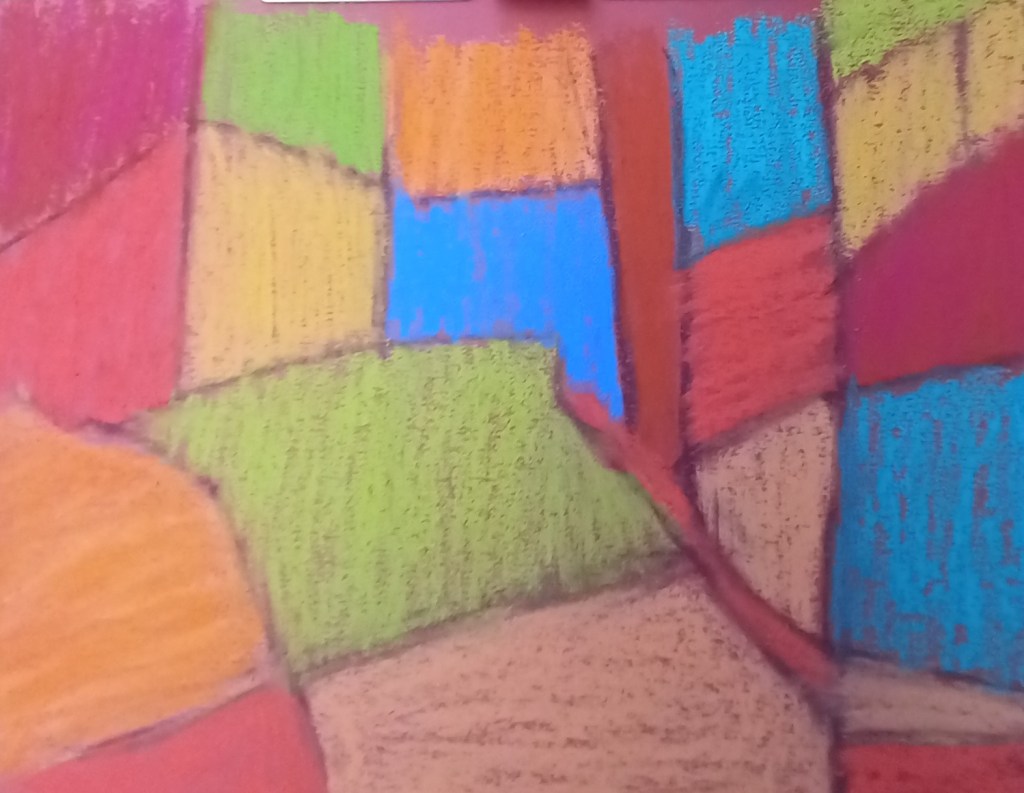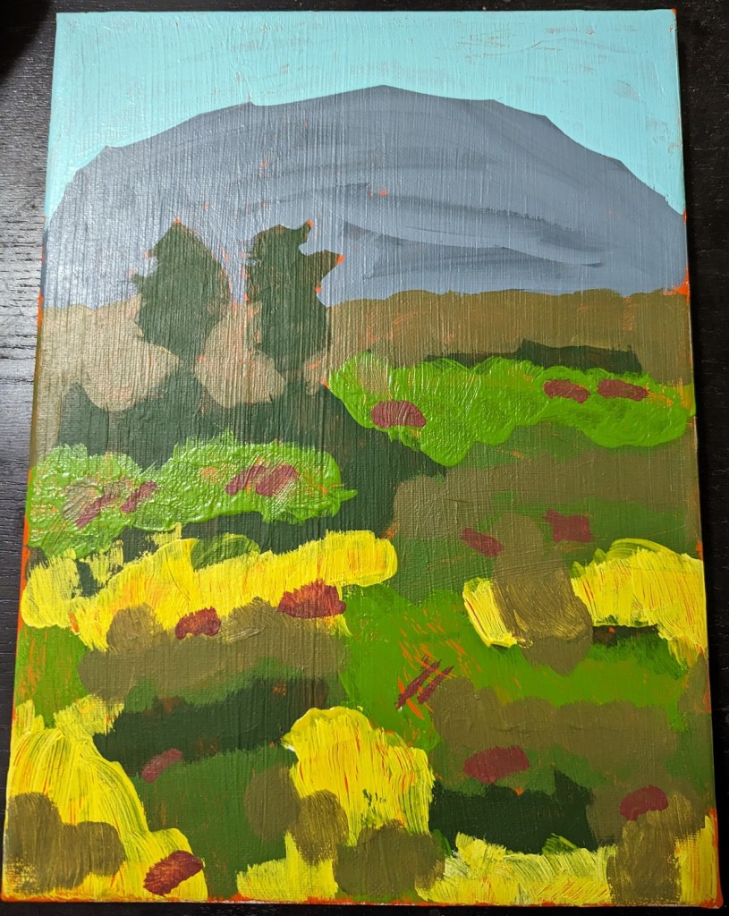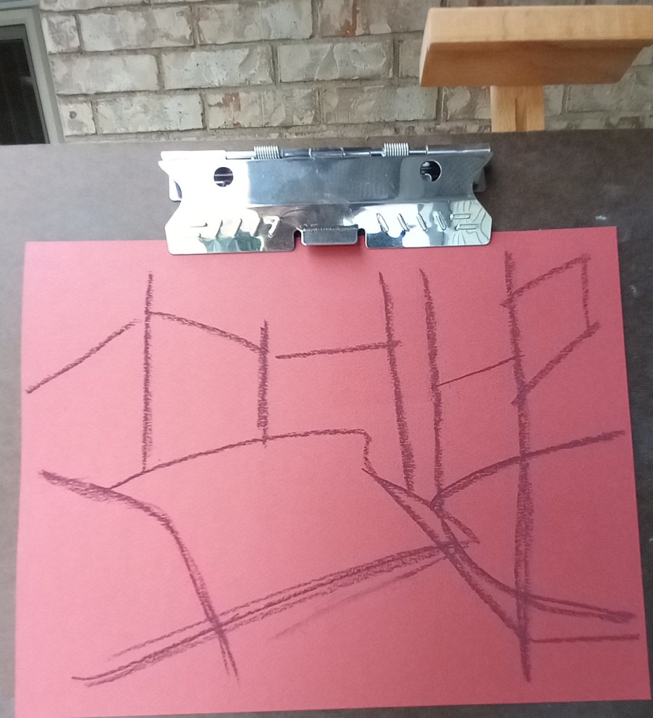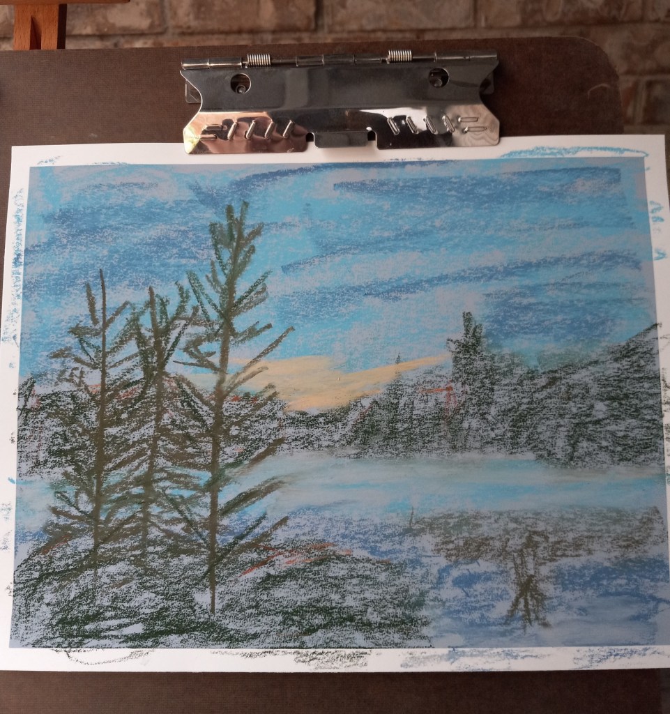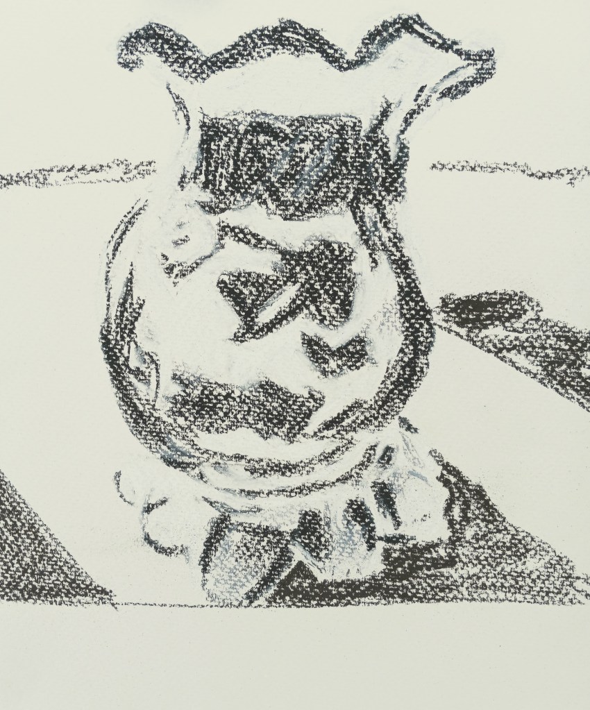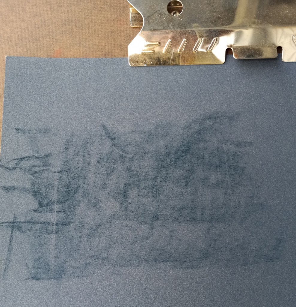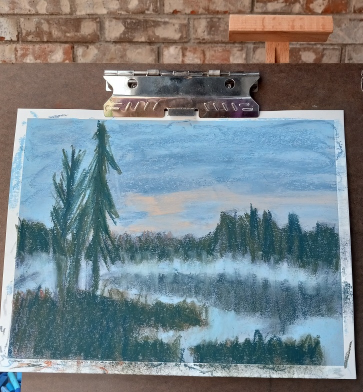 Sounds good, but I failed at color mixing. Ugh. I drew over the dried big splotches of paint (see right)with compressed charcoal because it wasn’t even obvious what the object was! Then I ended up deciding to heck with it, I’ll use a glaze of titanium white — and glazes, I’m told, are not successful with opaque pigments like titanium white.