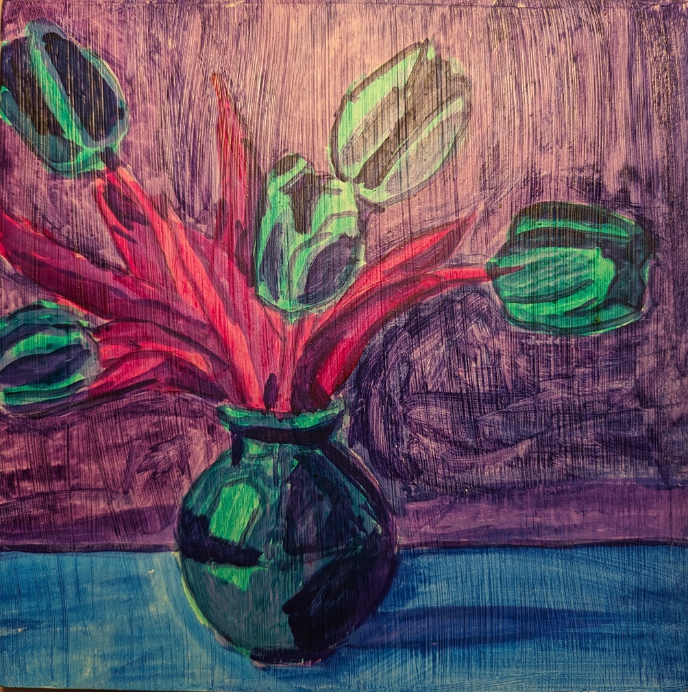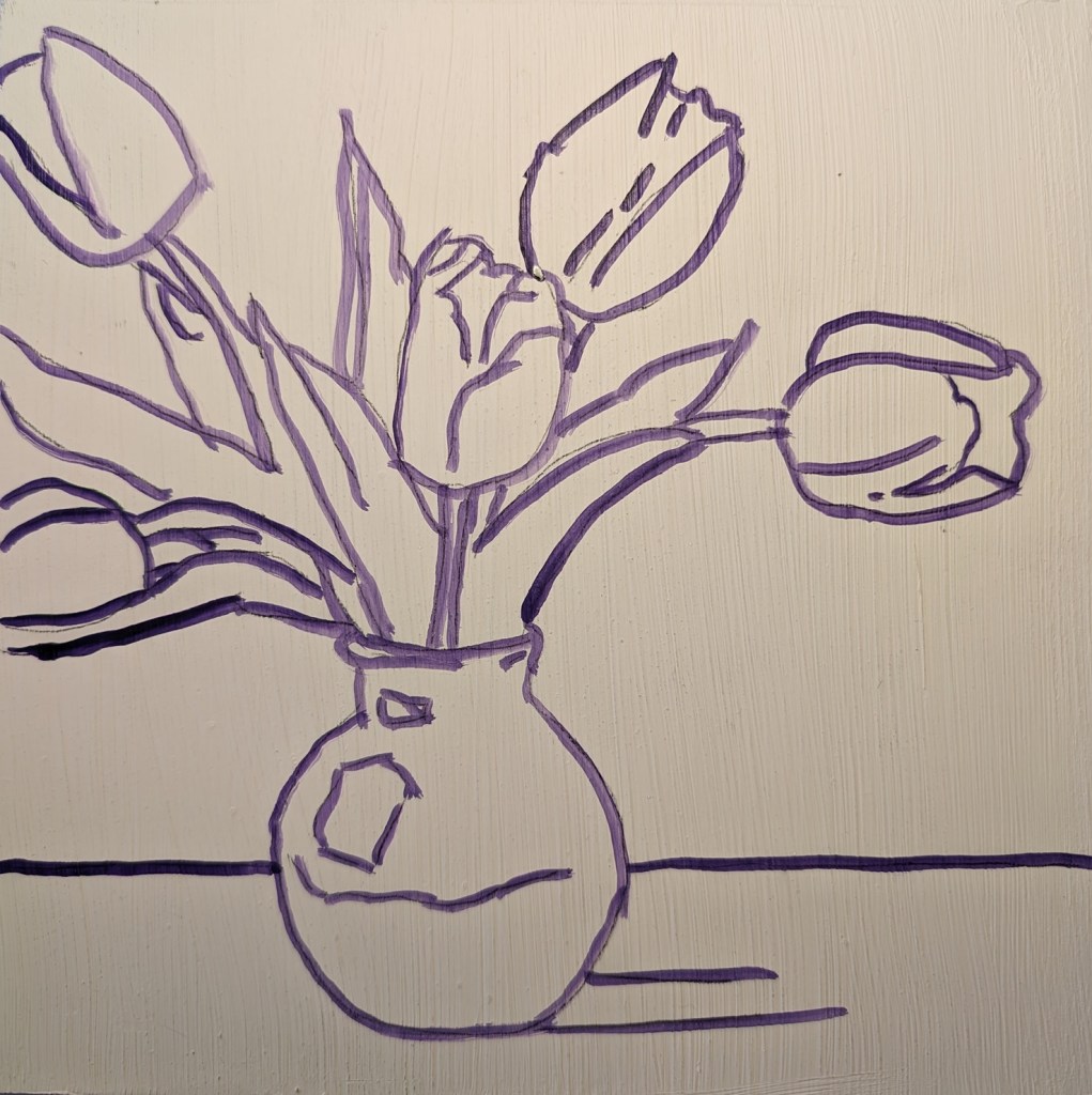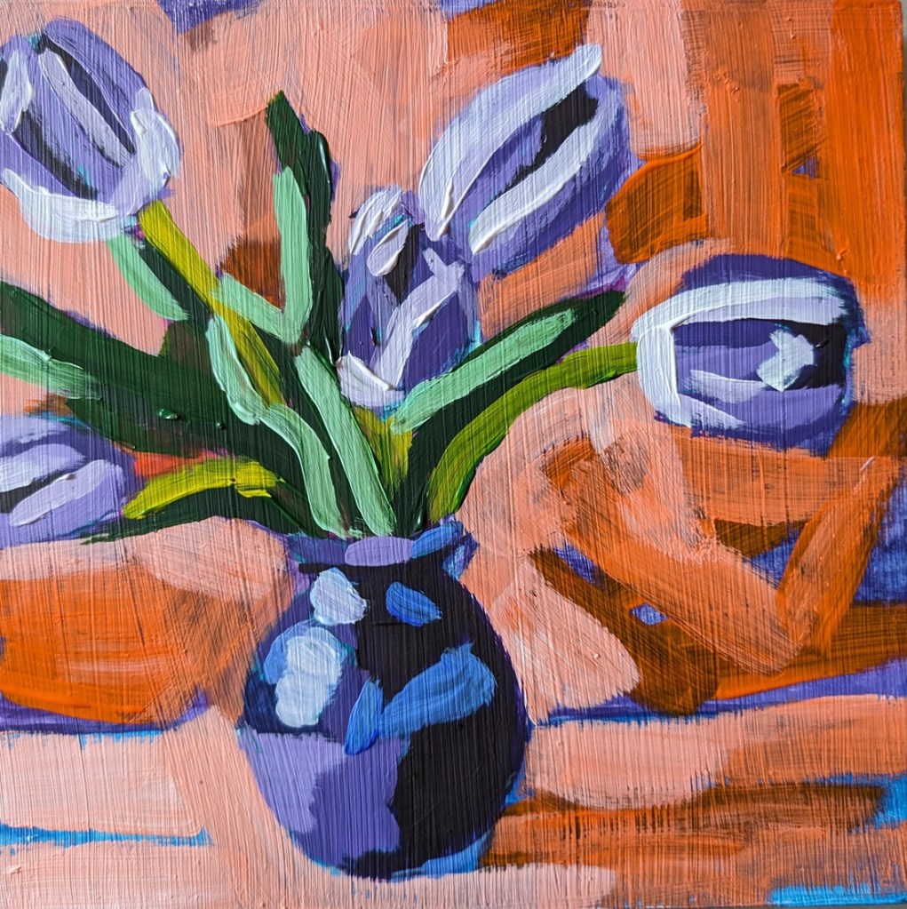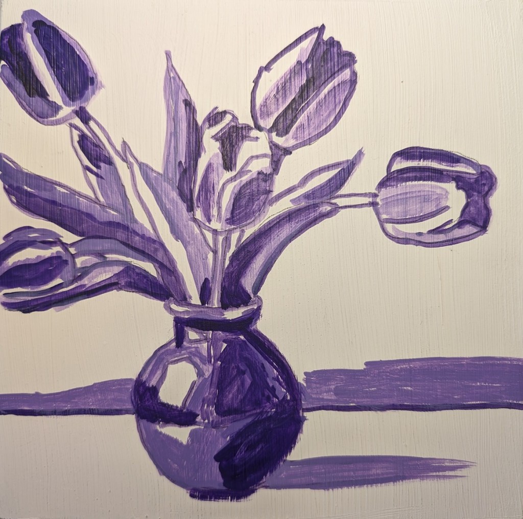 I finally finished the purple tulips. It’s not really my style, but I had to try it. If I could do it all over again, I’d either dilute the gesso with some water and use the biggest brush I could find (to minimize brush strokes / ridges, and I’d probably do it in at least a 10×10 size.