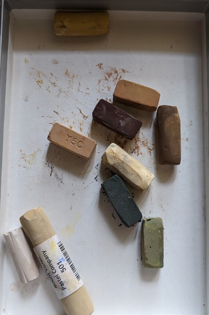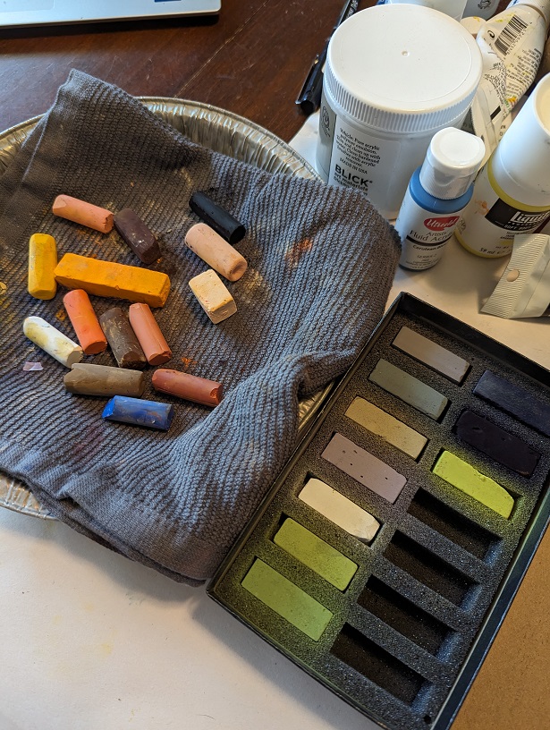 It’s on a “Slate” colored 6×8 4-ply Pastel Premier board that I bought some time ago when I trying out soft pastels. (So far, I’m still favoring acrylic paints, but this was fun to do!) The pastels I used are shown at right.