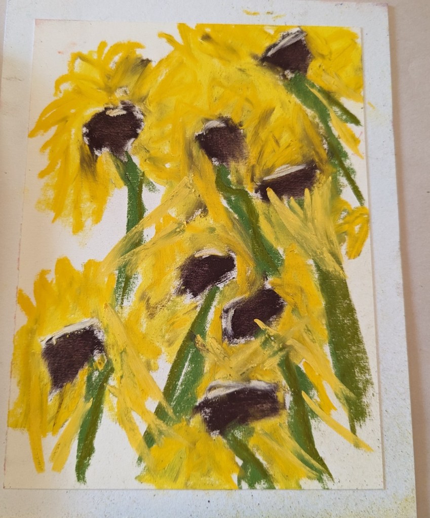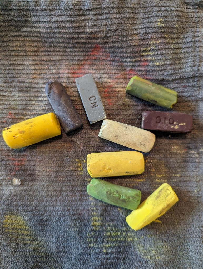I didn’t even use all the pastel sticks shown below — but one thing I would do differently would be to paint the centers last so as not to smear the yellow shades with the darker brown.