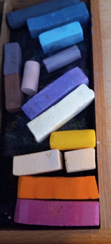 Gorgeous colors! These are almost all Great American, with some Blue Earth, a Terry Ludwig (light blue), and Mount Vision (darkest blue), and Dick Blick Artists’ Soft Pastels. The yellow is one of my Richeson Hand-Rolled yellows.