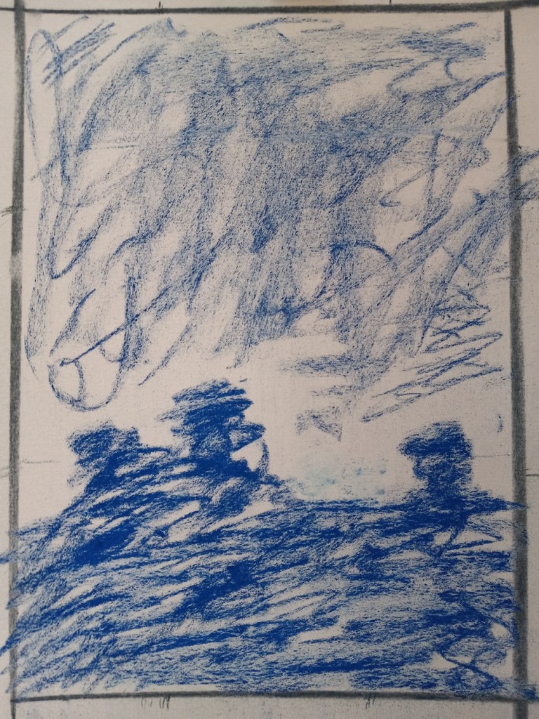 The first thing I did was to draw some thumbnails, using my Vincent Van Gogh brand of hard pastels, and vine charcoal. I decided to go with the vertical thumbnail on the bottom left as the reference for the sunset picture.