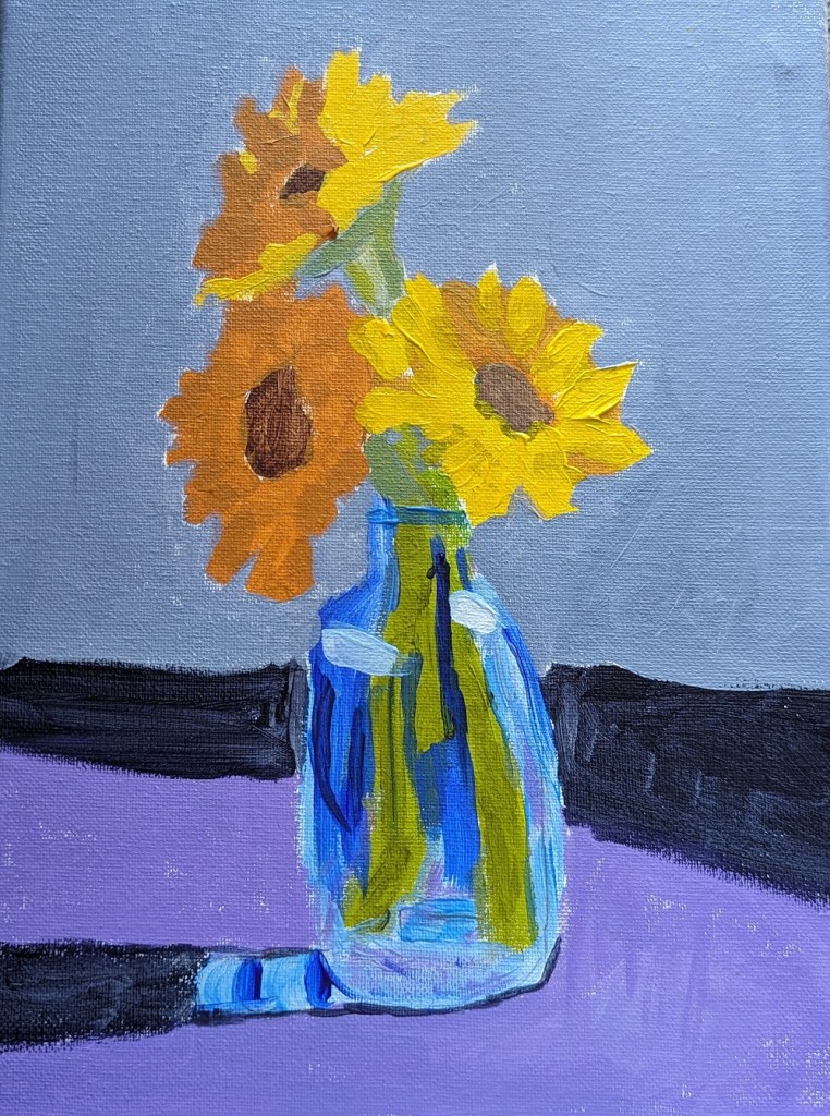The class covers basic suggested supplies, brushstrokes, values, the grayscale, color mixing, and 3 small paintings.