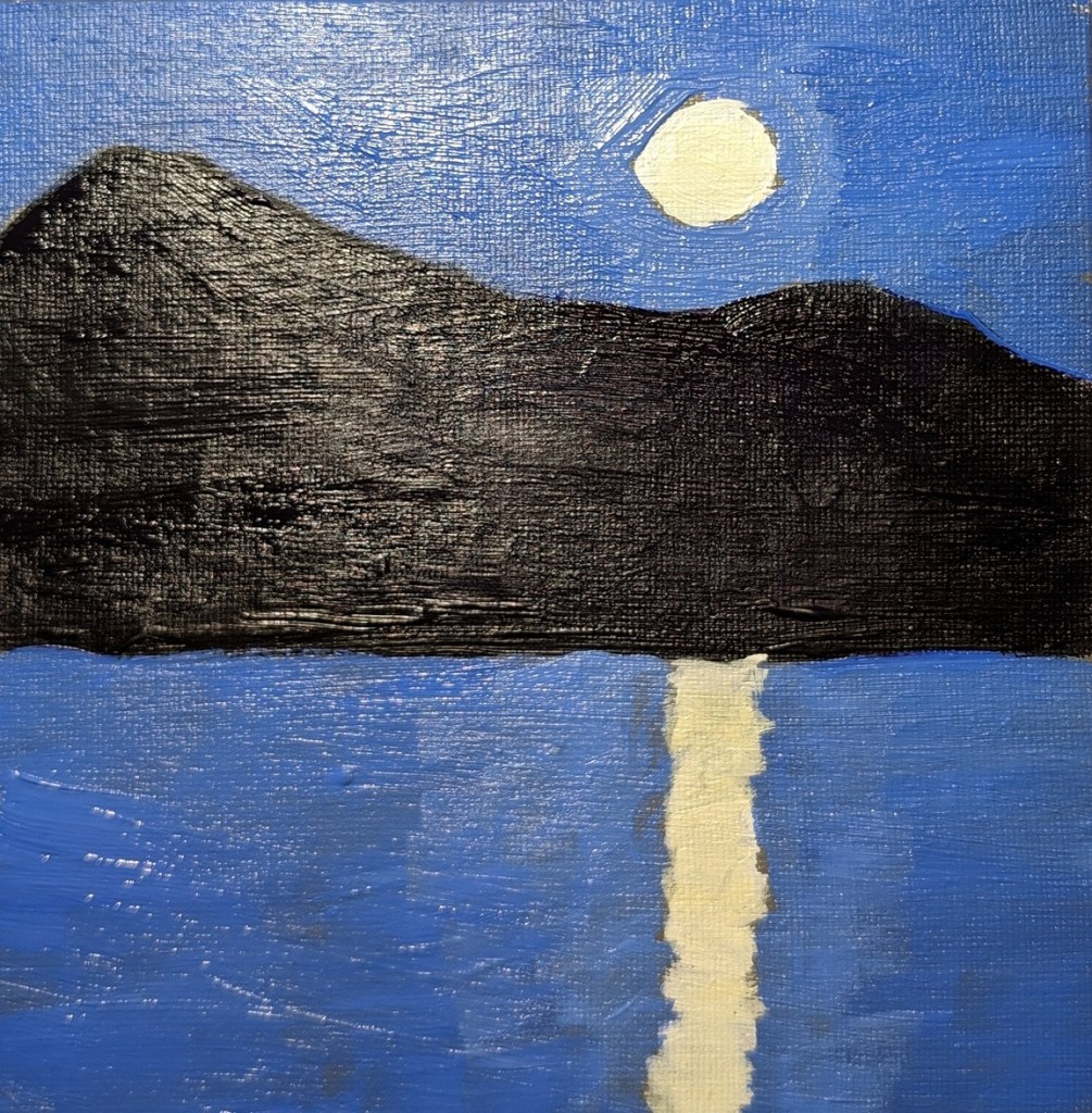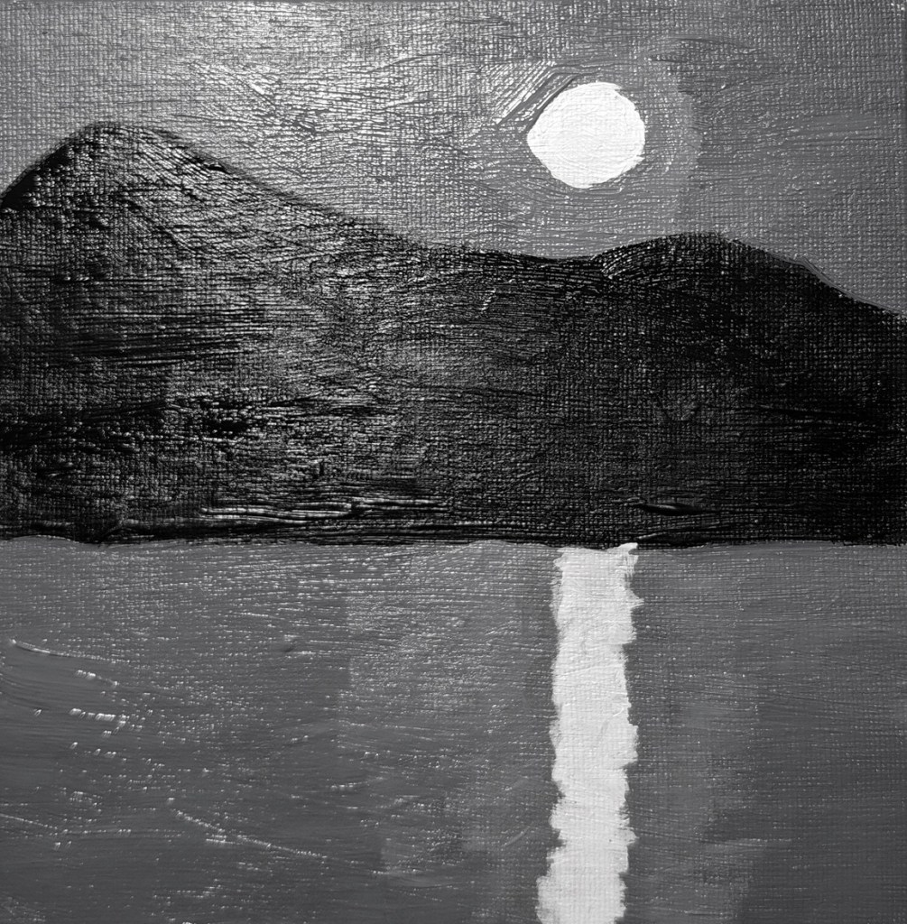 The first two paintings from the class are below. You paint the moon scene in grayscale first, and then paint color over it, keeping with the value map. The last photo is of the color painting, but in black & white to validate the value map.