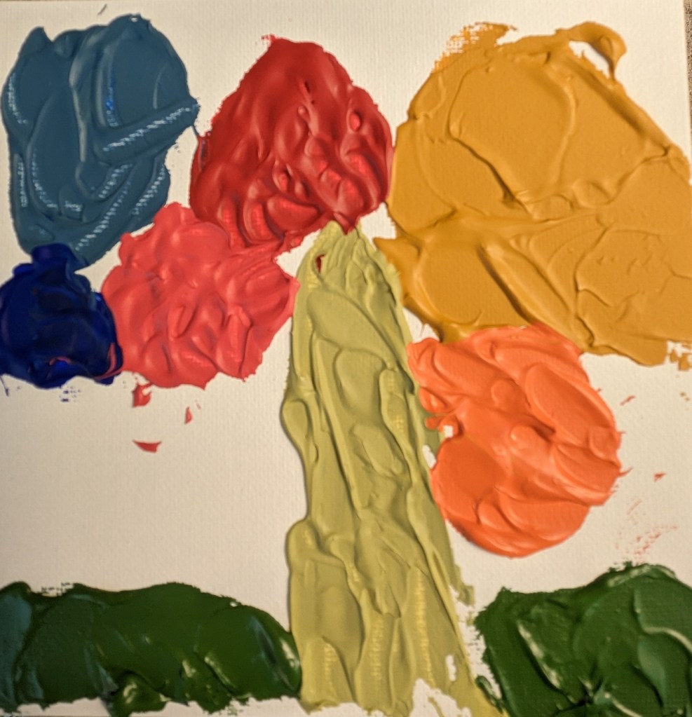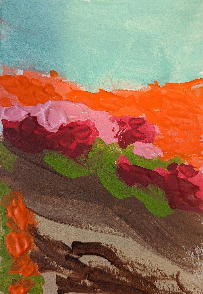 I tried out the different colors — except for black and white — on a 6×6 canvas panel. Further below, I did an abstract of azaleas on 4×6 watercolor paper.
