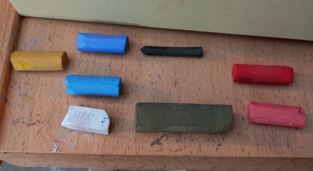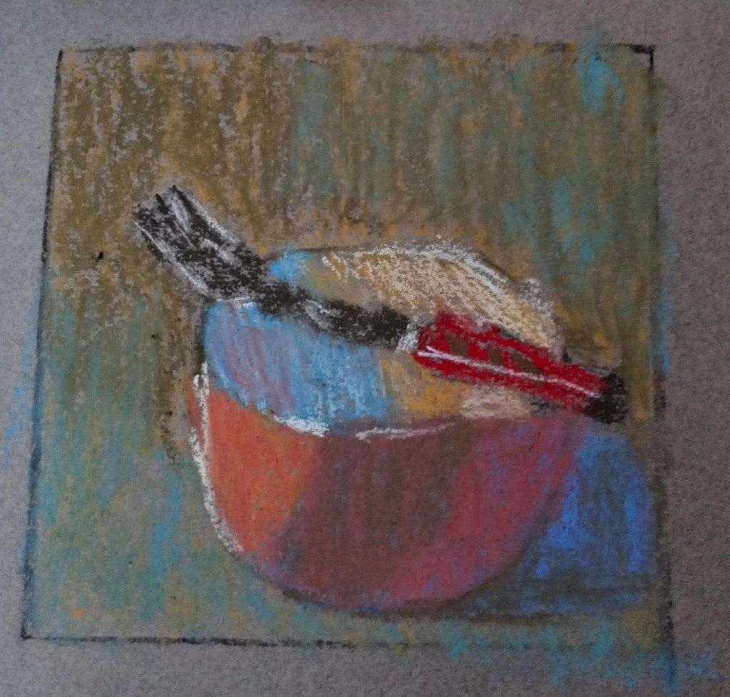 Gail Sibley has a video on YouTube wherein she uses white pastel paper, and a set of Terry Ludwig’s “Best Loved Basics” to paint a red-orange bowl with a fork balanced on it.
